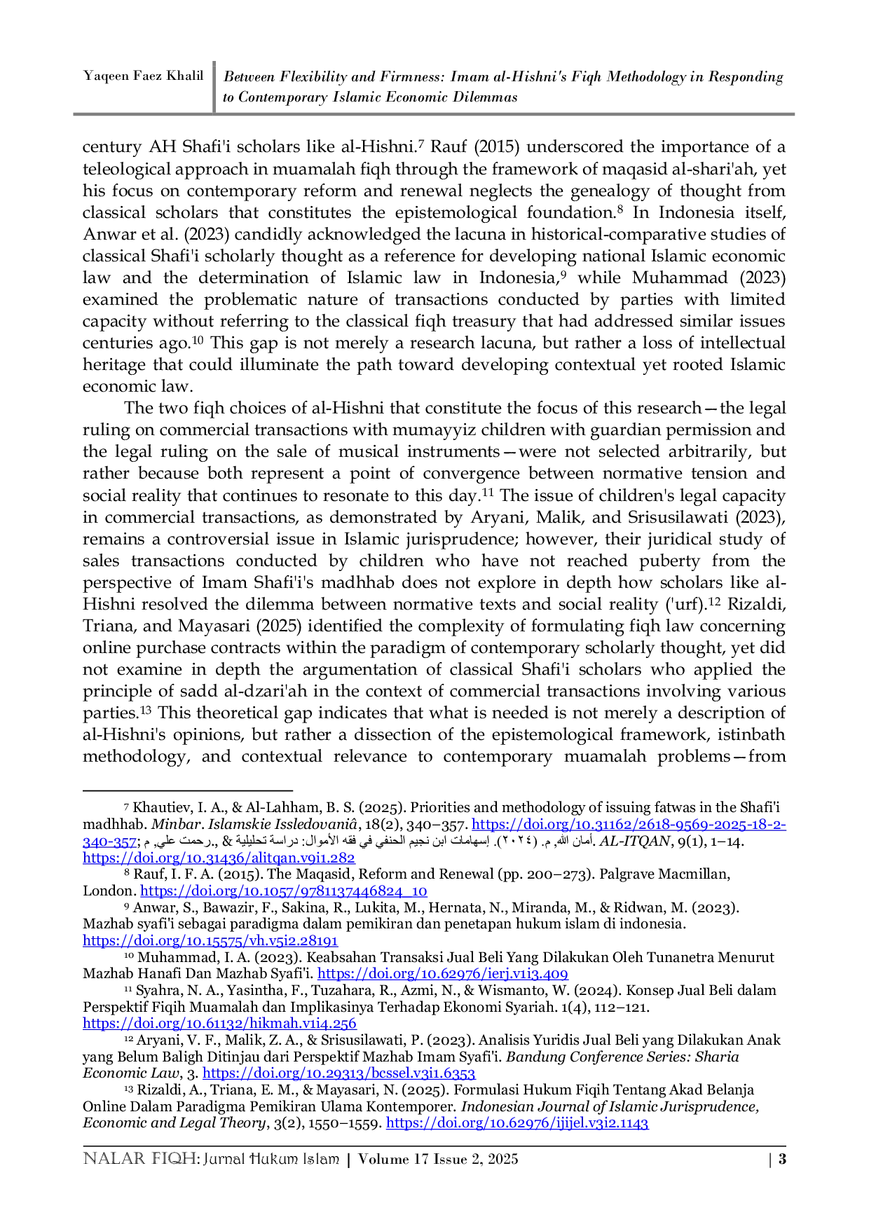 NALAR FIQH: Jurnal Hukum IslamNALAR FIQH: Jurnal Hukum IslamTransformasi ekonomi digital telah mendorong transaksi keuangan syariah mencapai USD 3,95 triliun pada tahun 2023; namun, diskontinuitas epistemologis masih bertahan antara praktik muamalah kontemporer dan warisan intelektual Islam klasik. Penelitian ini menganalisis pilihan-pilihan yurisprudensial (ikhtiyarat fiqhiyyah) Imam Taqiyuddin al-Hishni (752-829 H) mengenai transaksi komersial yang melibatkan anak mumayyiz (discerning minors) dan penjualan alat musik, sambil mengeksplorasi metodologi istinbathnya dan relevansinya dengan isu-isu ekonomi Islam kontemporer, khususnya dalam konteks e-commerce dan industri kreatif halal Indonesia yang bernilai USD 7,2 miliar. Dengan menggunakan pendekatan kualitatif melalui studi pustaka deskriptif-analitis, penelitian ini memanfaatkan sumber-sumber primer termasuk Kifayah al-Akhyar karya al-Hishni dan karya biografi klasik, yang dilengkapi dengan sumber sekunder meliputi literatur tafsir dan fikih perbandingan. Analisis data menerapkan teknik analisis konten terarah yang didasarkan pada kerangka teoritis usul fikih dan maqasid al-syariah. Temuan penelitian menunjukkan bahwa al-Hishni menerapkan fleksibilitas kontekstual terkait transaksi oleh anak mumayyiz, mengizinkan transaksi tersebut jika ada persetujuan wali dan nilai yang setara, berdasarkan prinsip ammah bihi al-balwa dan istishlah. Sebaliknya, ia mengambil posisi tegas melarang perdagangan alat musik dengan menerapkan sadd al-dzariah, berargumen bahwa fungsi utama alat tersebut mendorong kelalaian dari mengingat Allah meskipun memiliki nilai ekonomi. Metodologi al-Hishni, yang membedakan kapan harus bersikap fleksibel dalam masalah teknis-prosedural demi kepentingan umum dan kapan harus mempertahankan ketegasan dalam melindungi nilai-nilai spiritual, menawarkan kontribusi teoritis yang signifikan terhadap pengembangan teori ahliyyah al-ada al-naqishah (kapasitas hukum tidak sempurna untuk bertindak) dalam hukum ekonomi Islam. Lebih lanjut, ini memberikan kontribusi praktis sebagai kerangka acuan untuk merumuskan fatwa DSN-MUI terkait partisipasi kaum muda dalam platform fintech syariah dan mengembangkan standar sertifikasi hiburan halal yang komprehensif untuk ekosistem industri kreatif Indonesia.