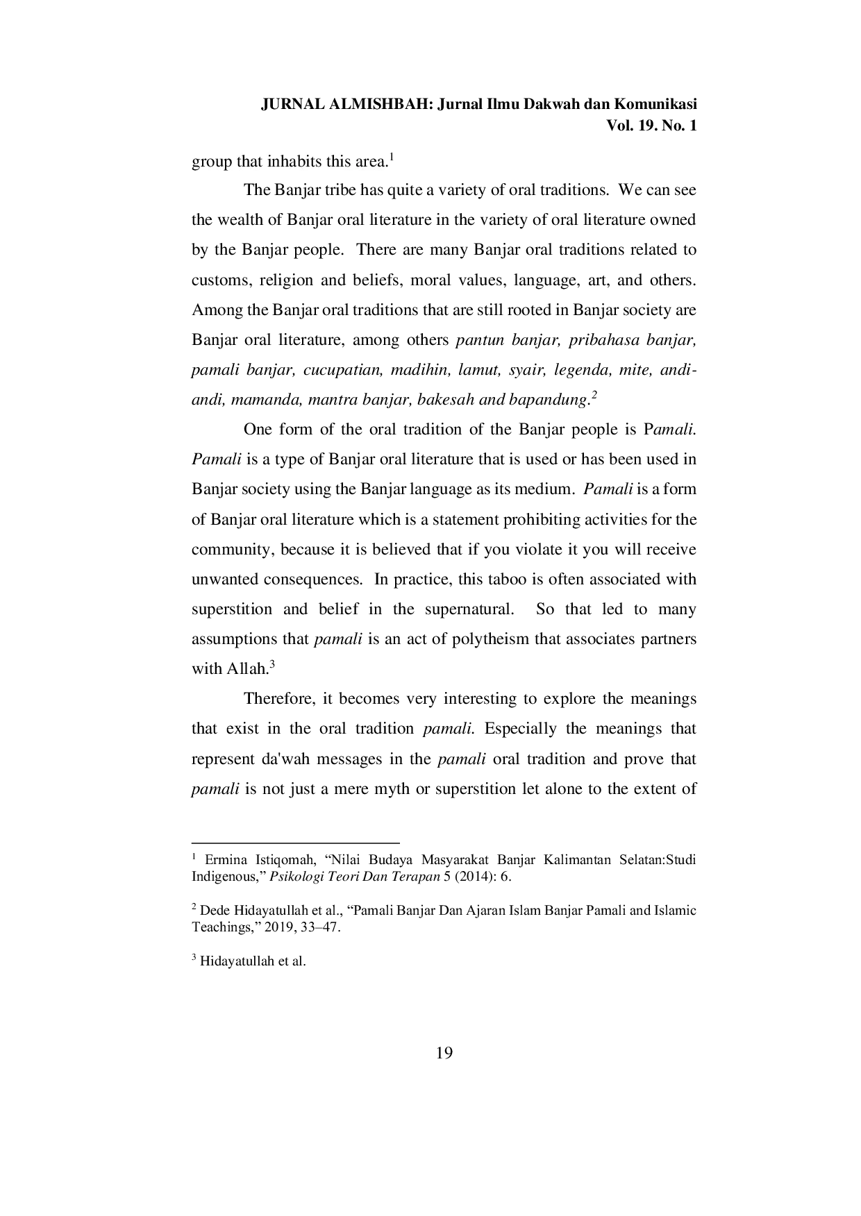 Al-Mishbah: Jurnal Ilmu Dakwah dan KomunikasiAl-Mishbah: Jurnal Ilmu Dakwah dan KomunikasiPamali masih digunakan dalam kehidupan masyarakat Urang Banjar. Namun, di sisi lain, Pamali seringkali dikaitkan dengan kepercayaan takhayul dan kepercayaan hanya kepada hal-hal gaib. Sehingga banyak yang menganggap bahwa pamali merupakan tindakan politeisme. Studi ini bertujuan untuk menjelaskan bahwa tidak semua Pamali mengarah pada tindakan politeisme dan kepercayaan takhayul, tetapi terdapat beberapa bait dalam pamali yang juga mengandung nilai-nilai dakwah. Data yang digunakan oleh penulis dalam penelitian ini adalah data yang diperoleh dari studi kepustakaan. Data yang terkumpul akan dianalisis secara semiotik dengan teknik interpretatif. Penelitian ini merupakan jenis penelitian tinjauan pustaka dengan mencari referensi teoritis yang relevan dengan kasus atau masalah yang ditemukan. Hasil dari penelitian ini membuktikan bahwa terdapat beberapa nilai-nilai dakwah yang terkandung dalam tradisi lisan pamali, yaitu nilai-nilai syariah dan moral. Dengan demikian, dapat dikatakan bahwa pamali tidak semuanya berkaitan dengan takhayul atau politeisme. Karena itu, terdapat banyak tradisi sastra lisan lain yang dianggap tabu dan bahkan syirik selain Banjar pamali meskipun terdapat nilai-nilai dakwah di dalamnya.