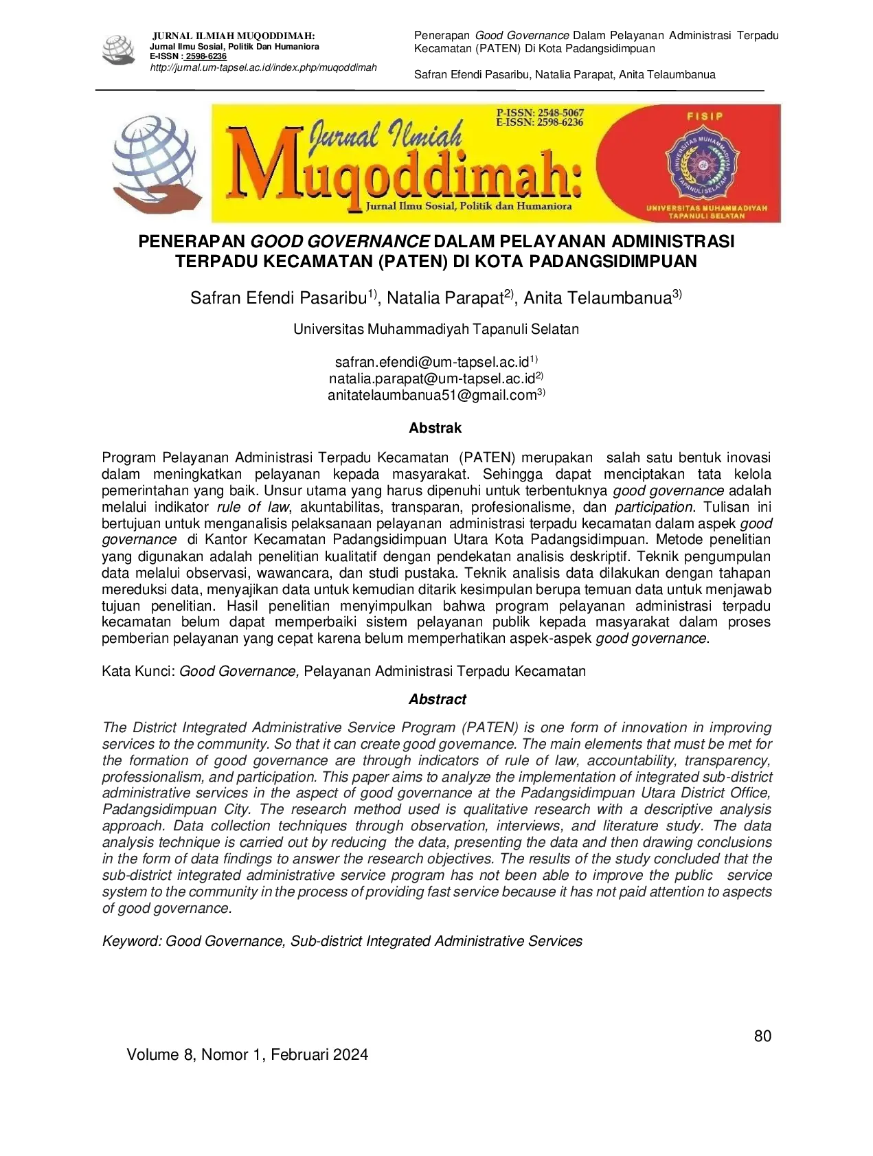 Jurnal Ilmiah Muqoddimah : Jurnal Ilmu Sosial, Politik, dan HumanioraJurnal Ilmiah Muqoddimah : Jurnal Ilmu Sosial, Politik, dan HumanioraProgram Pelayanan Administrasi Terpadu Kecamatan (PATEN) merupakan salah satu bentuk inovasi dalam meningkatkan pelayanan kepada masyarakat. Sehingga dapat menciptakan tata kelola pemerintahan yang baik. Unsur utama yang harus dipenuhi untuk terbentuknya good governance adalah melalui indikator rule of law, akuntabilitas, transparan, profesionalisme, dan participation. Tulisan ini bertujuan untuk menganalisis pelaksanaan pelayanan administrasi terpadu kecamatan dalam aspek good governance di Kantor Kecamatan Padangsidimpuan Utara Kota Padangsidimpuan. Metode penelitian yang digunakan adalah penelitian kualitatif dengan pendekatan analisis deskriptif. Teknik pengumpulan data melalui observasi, wawancara, dan studi pustaka. Teknik analisis data dilakukan dengan tahapan mereduksi data, menyajikan data untuk kemudian ditarik kesimpulan berupa temuan data untuk menjawab tujuan penelitian. Hasil penelitian menyimpulkan bahwa program pelayanan administrasi terpadu kecamatan belum dapat memperbaiki sistem pelayanan publik kepada masyarakat dalam proses pemberian pelayanan yang cepat karena belum memperhatikan aspek-aspek good governance.