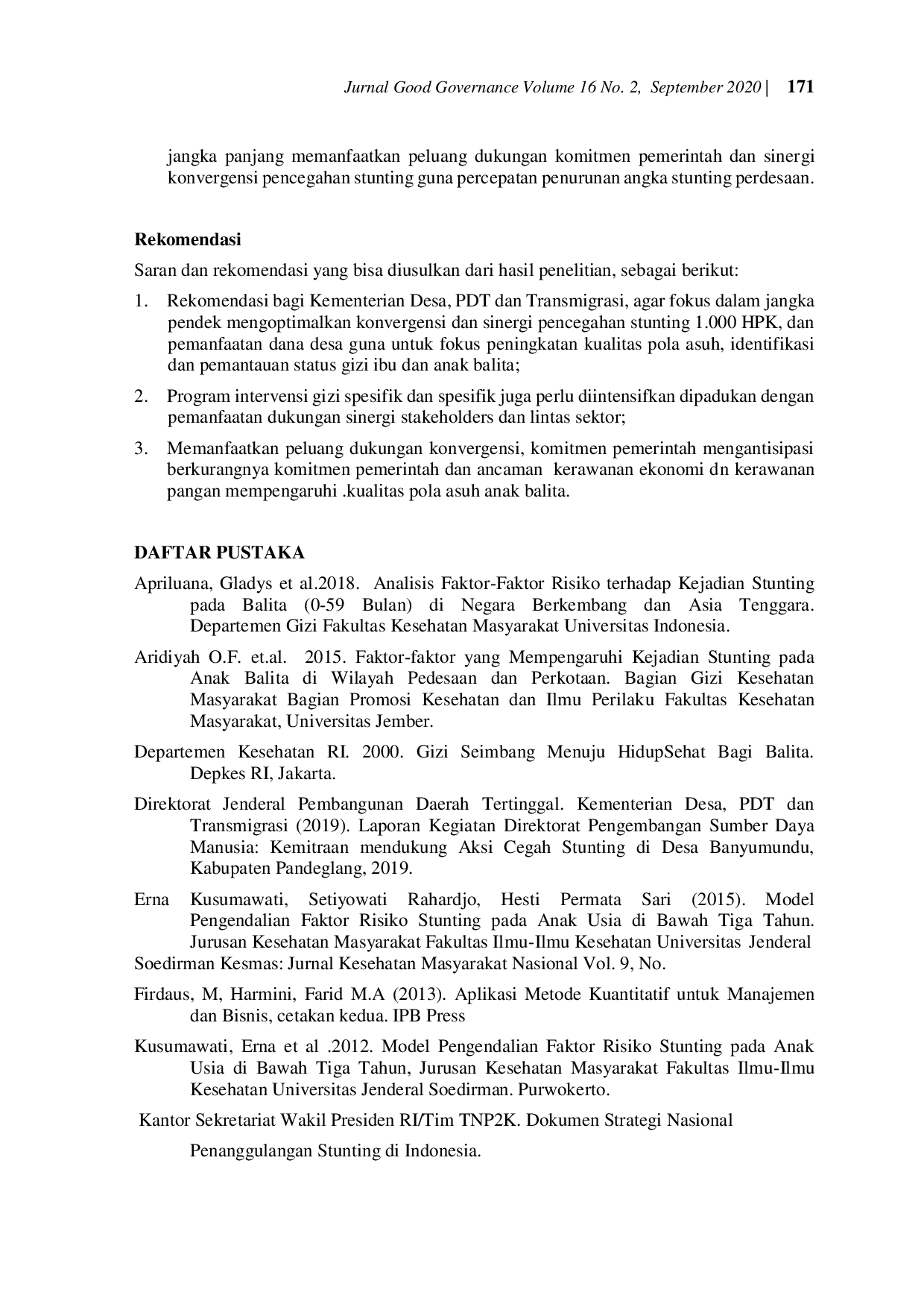 Jurnal Good GovernanceJurnal Good GovernanceStunting menjadi masalah dunia karena implikasinya menentukan masa depan bangsa. Indonesia sebagai negara berkembang masih memiliki tingat prevalensi stunting tinggi. Menurut data Riset Kesehatan Dasar (Riskesdas) tahun 2018 angka prevalensi stunting tercatat 8,7 juta (30,7%) bayi berumur bawah lima tahun (balita) mengalami stunting. Angka ini masih jauh dari angka target yang ditetapkan oleh Badan Kesehatan Dunia (WHO), seharusnya angka stunting tidak lebih dari 20%. Dijumpai kendala pelaksanaan pencapaian target penurunan stunting antara lain karena belum tersedianya strategi komprehensif untuk dijabarkan dalam pelaksanaan program intervensi mendukung pencegahan stunting, mulai perbaikan gizi dan kesehatan ibu dan anak balita pada 1.000 Hari Pertama Kehidupan (1.000 HPK). Penelitian dilakukan mulai Februari sampai dengan Juli 2020 dengan tujuan menganalisis perancangan strategi percepatan penurunan stunting perdesaan, lokasi penelitian di Desa Banyumundu, Kecamatan Kaduhejo, Kabupaten Pandeglang. Lokasi penelitian tersebut merupakan tempat uji coba aksi cegah stunting yang dilaksanakan pada Agustus 2018 sampai dengan Februati 2019 yang menghasilkan contoh baik (best practices) percepatan penurunan stunting perdesaan. Metoda penelitian menggunakan pendekatan kualitatif deskriptif dengan teknik Analytical Hierarchy Process (AHP) dan SWOT dalam penentuan alternatif program intervensi dan strategi yang efektif untuk percepatan penurunan stunting. Hasil penelitian menunjukkan program intervensi dengan sasaran utama peningkatan pola asuh anak balita / bawah dua tahun (baduta) melalui program intervensi peningkatan status gizi sebagai upaya pencegahan stunting periode 1.000 HPK perlu diprioritaskan untuk percepatan (akselerator) penurunan stunting perdesaan. Hasil evaluasi faktor strategik internal dan eksternal analisis SWOT menunjukkan bahwa strategi yang paling efektif untuk percepatan penurunan stunting adalah kombinasi strategi agresif. Dalam jangka pendek perlu dioptimalksan intervensi gizi spesifik dan sensitif, sedangkan strategi jangka panjang perlu diintensifkan peluang dukungan kolaborasi antar sektor dan multistakehoders guna menjamin keberlanjutan dan pencapaian sasaran akselerasi penurunan stunting. Selain itu perlu penerapan strategi Public Private Partnership dalam upaya penegakan tatakelola (governance) diperlukan komitmen penjabaran operasional agar menjamin program pencegahan stunting balita perdesaan pada 1.000 HPK.