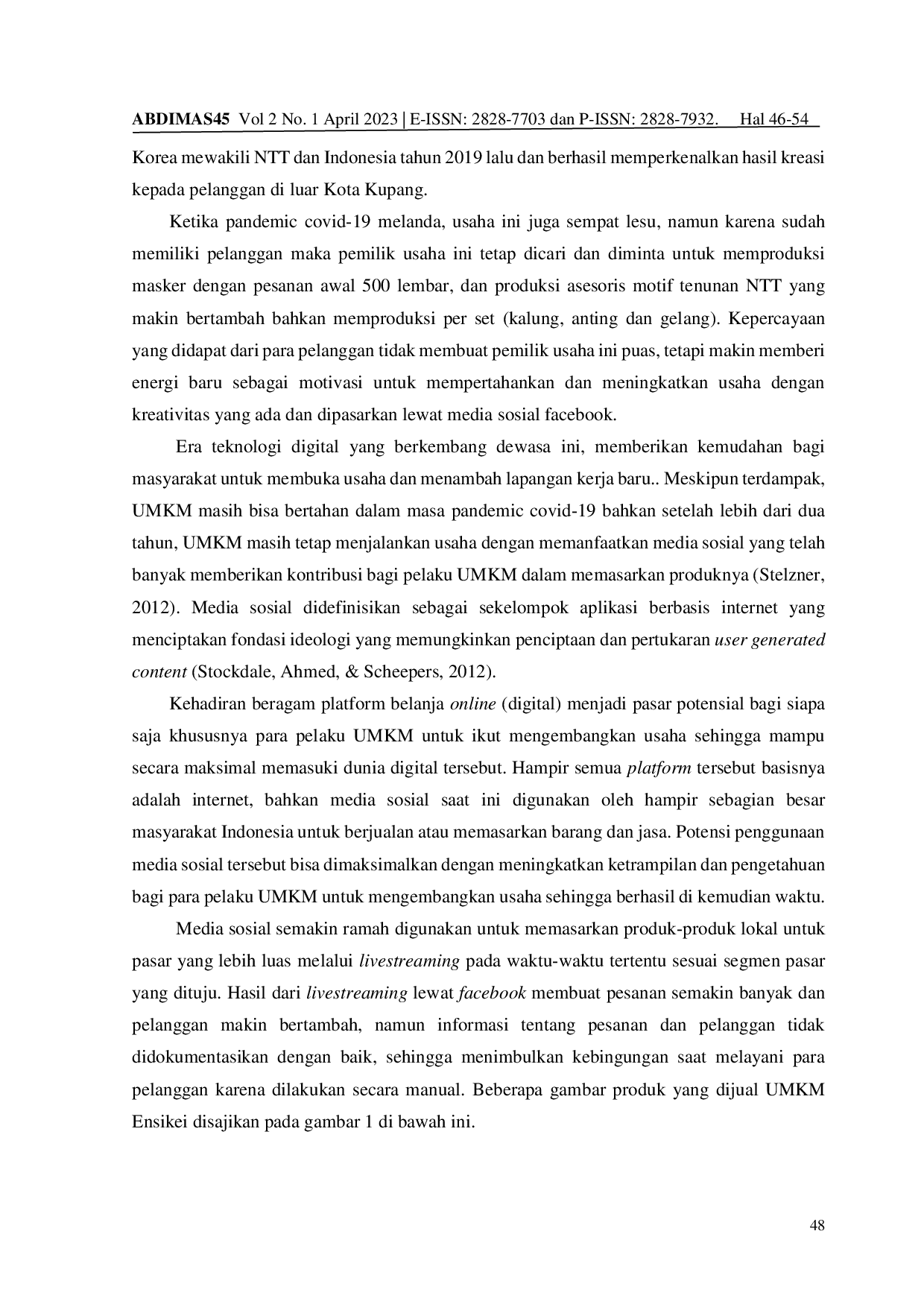 Jurnal Pengabdian MasyarakatJurnal Pengabdian MasyarakatUMKM merupakan salah satu penyokong perekonomian di Indonesia khususnya pada masyarakat golongan bawah dan menengah. UMKM memiliki peran strategis dalam upaya pemerintah dalam mengatasi kemiskinan dan pengangguran, karena UMKM dapat menyerap tenaga kerja, sehingga pengangguran akibat tidak terserapnya angkatan kerja dalam dunia kerja menjadi berkurang. Salah satu UMKM yang berkembang di Kota Kupang adalah UMKM Ensikei, usaha ini dimulai dari usaha rumahan yang memproduksi dan menjual asesoris dan perhiasan dari batu-batuan lokal (muti) dan juga dari bahan tenunan motif NTT, serta ikut memasarkan beberapa produk dari perajin lokal lainnya seperti: gula jahe, VCO, fashion, tas dan sepatu motif tenunan NTT. Merespon perubahan akibat pandemic covid-19, yang berakibat penjualan lesu, maka cara yang mudah adalah menggunakan pemasaran digital melalui media sosial. Untuk meningkatkan keterampilan penggunaan media sosial yang tepat dan bermanfaat,maka perlu ada pelatihan dna pendampingan secara berkala bagi UMKM Ensikei.