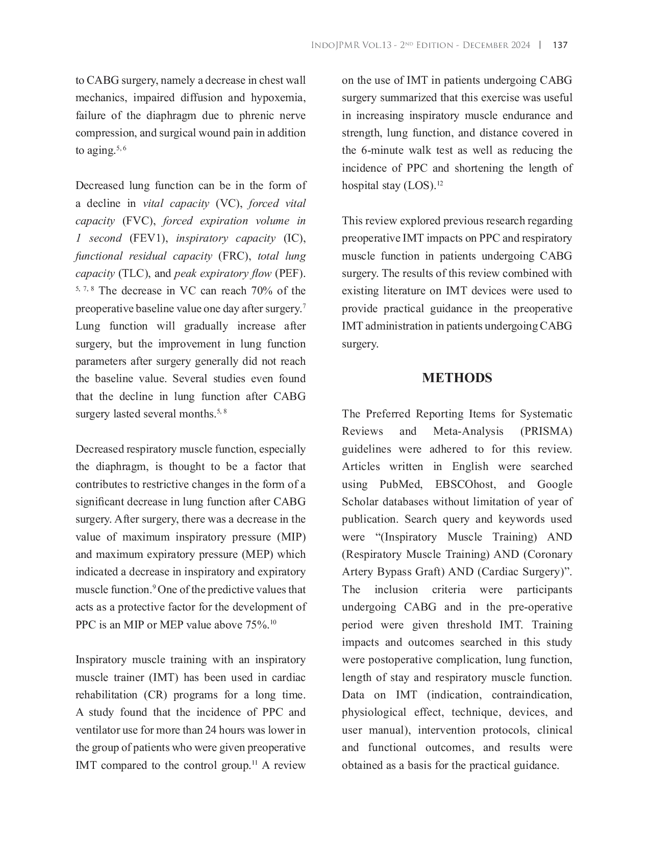 Indonesian Journal of Physical Medicine and RehabilitationIndonesian Journal of Physical Medicine and RehabilitationPendahuluan: Operasi bypass arteri koroner (BPAK) meningkatkan harapan hidup pasien penyakit arteri koroner, namun operasi itu sendiri dapat menyebabkan komplikasi paru pasca operasi (KPPO). KPPO dikaitkan dengan penurunan fungsi otot pernapasan dan paru-paru. Latihan otot inspirasi (LOI) telah digunakan dalam rehabilitasi jantung untuk pasien pasca-BPAK. Tinjauan ini bertujuan untuk menjelaskan dampak LOI pra operasi terhadap KPPO dan fungsi otot pernapasan pada pasien yang menjalani operasi BPAK. Metode: Artikel berbahasa Inggris dicari menggunakan database PubMed, EBSCOhost, dan Google Scholar tanpa batasan tahun publikasi menggunakan algoritma dan kata kunci pencarian. Kriteria inklusinya adalah pasien yang menjalani BPAK pada masa pra operasi dan diberikan LOI dengan alat threshold. Hasil dan Pembahasan: LOI pra operasi tidak meningkatkan fungsi paru, namun mencegah penurunan fungsi paru pasca operasi. Angka kejadian KPPO lebih rendah dan lama rawat inap lebih pendek pada pasien yang diberikan LOI pra operasi dibandingkan dengan kontrol. LOI pra operasi juga meningkatkan kekuatan dan daya tahan otot inspirasi yang berhubungan dengan penurunan KPPO. Kesimpulan: Penggunaan LOI pra operasi pada pasien yang menjalani BPAK terbukti dapat mencegah KPPO dan meningkatkan fungsi otot pernapasan. Tinjauan ini memberikan panduan praktis untuk LOI pra operasi untuk meningkatkan luaran pasien yang menjalani BPAK.