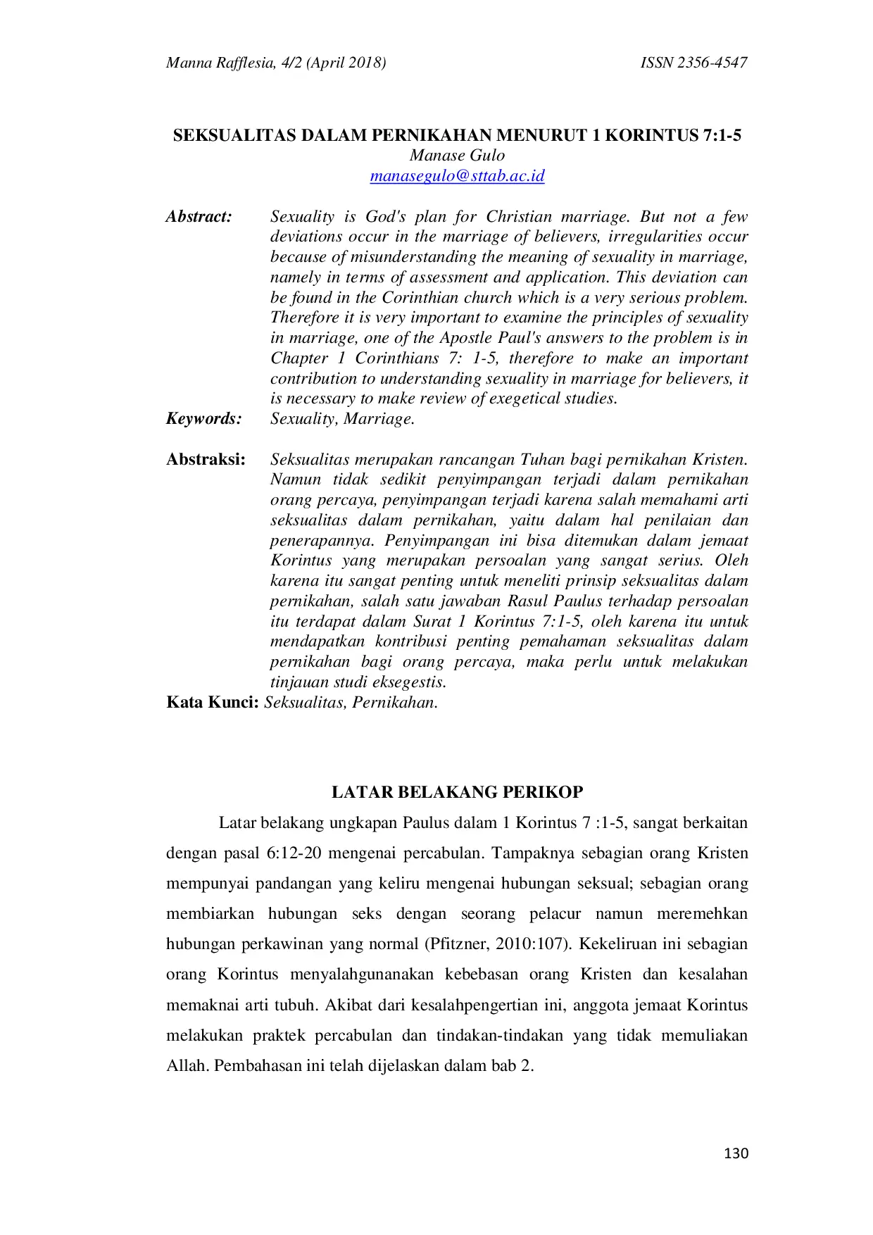 MAN_RAFMAN_RAFSeksualitas merupakan rancangan Tuhan bagi pernikahan Kristen. Namun tidak sedikit penyimpangan terjadi dalam pernikahan orang percaya, penyimpangan terjadi karena salah memahami arti seksualitas dalam pernikahan, yaitu dalam hal penilaian dan penerapannya. Penyimpangan ini bisa ditemukan dalam jemaat Korintus yang merupakan persoalan yang sangat serius. Oleh karena itu sangat penting untuk meneliti prinsip seksualitas dalam pernikahan, salah satu jawaban Rasul Paulus terhadap persoalan itu terdapat dalam Surat 1 Korintus 7:1-5, oleh karena itu untuk mendapatkan kontribusi penting pemahaman seksualitas dalam pernikahan bagi orang percaya, maka perlu untuk melakukan tinjauan studi eksegetic.