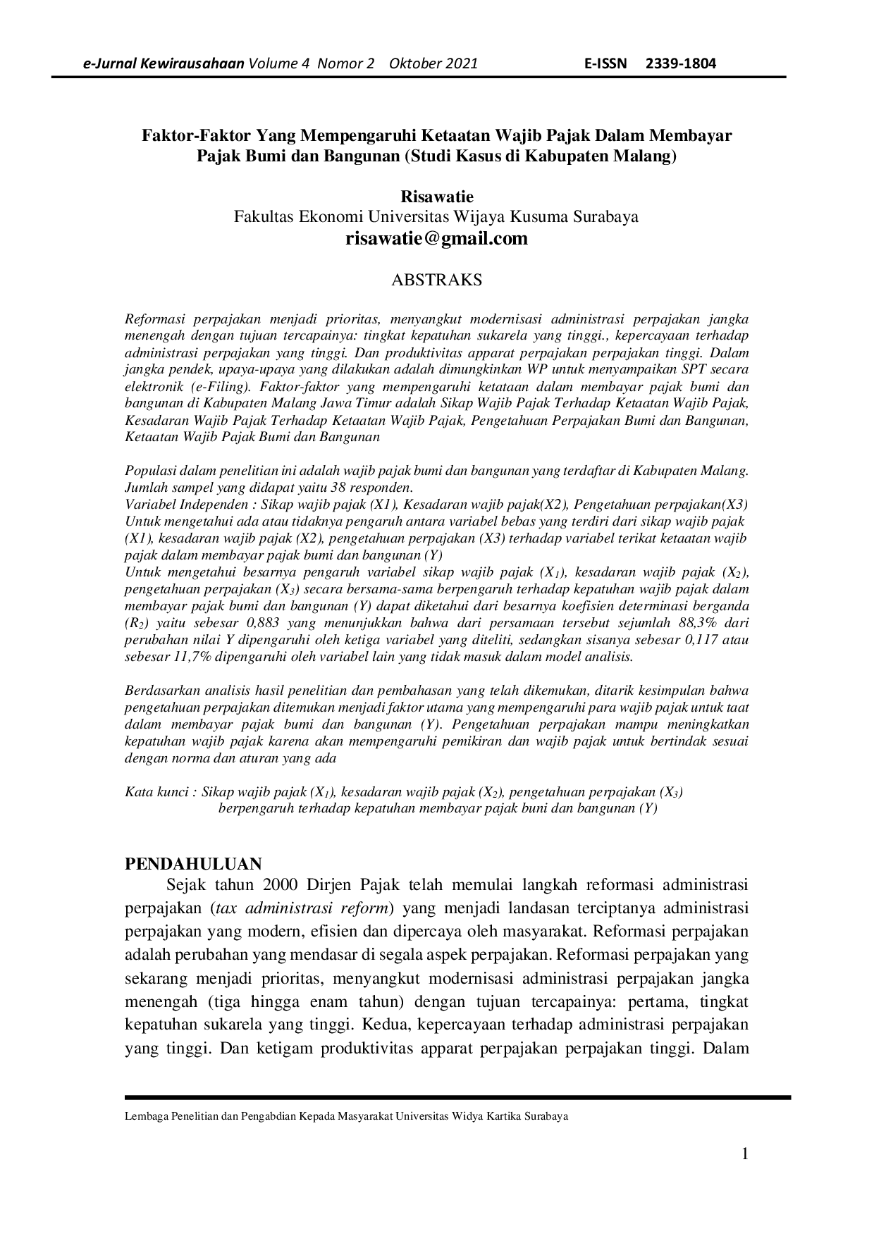 e-Jurnal Kewirausahaane-Jurnal KewirausahaanReformasi perpajakan menjadi prioritas, menyangkut modernisasi administrasi perpajakan jangka menengah dengan tujuan tercapainya tingkat kepatuhan sukarela yang tinggi, kepercayaan terhadap administrasi perpajakan yang tinggi, dan produktivitas apparat perpajakan tinggi.