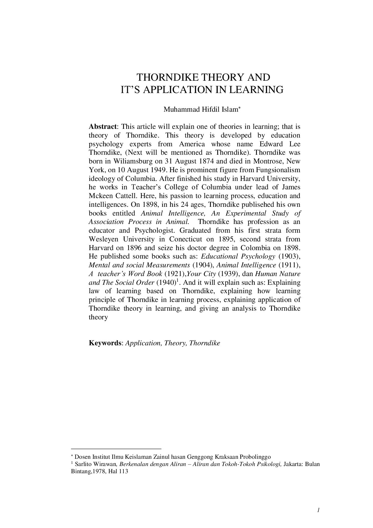 At- Ta'lim : Jurnal PendidikanAt- Ta'lim : Jurnal PendidikanArtikel ini akan menjelaskan salah satu teori dalam pembelajaran, yaitu teori Thorndike. Teori ini dikembangkan oleh ahli psikologi pendidikan dari Amerika Serikat bernama Edward Lee Thorndike. Teori Thorndike menjelaskan bahwa belajar adalah perubahan perilaku yang dapat diobservasi, diukur, dan dinilai secara konkret. Perubahan stimulus akan menghasilkan respons berdasarkan hukum mekanistik. Teori ini sering disebut sebagai teori koneksionisme atau teori asosiasi. Thorndike juga menambahkan beberapa hukum dalam teorinya, seperti hukum respons ganda, hukum sikap, hukum keunggulan elemen, hukum respons analogi, dan hukum pergeseran asosiatif.