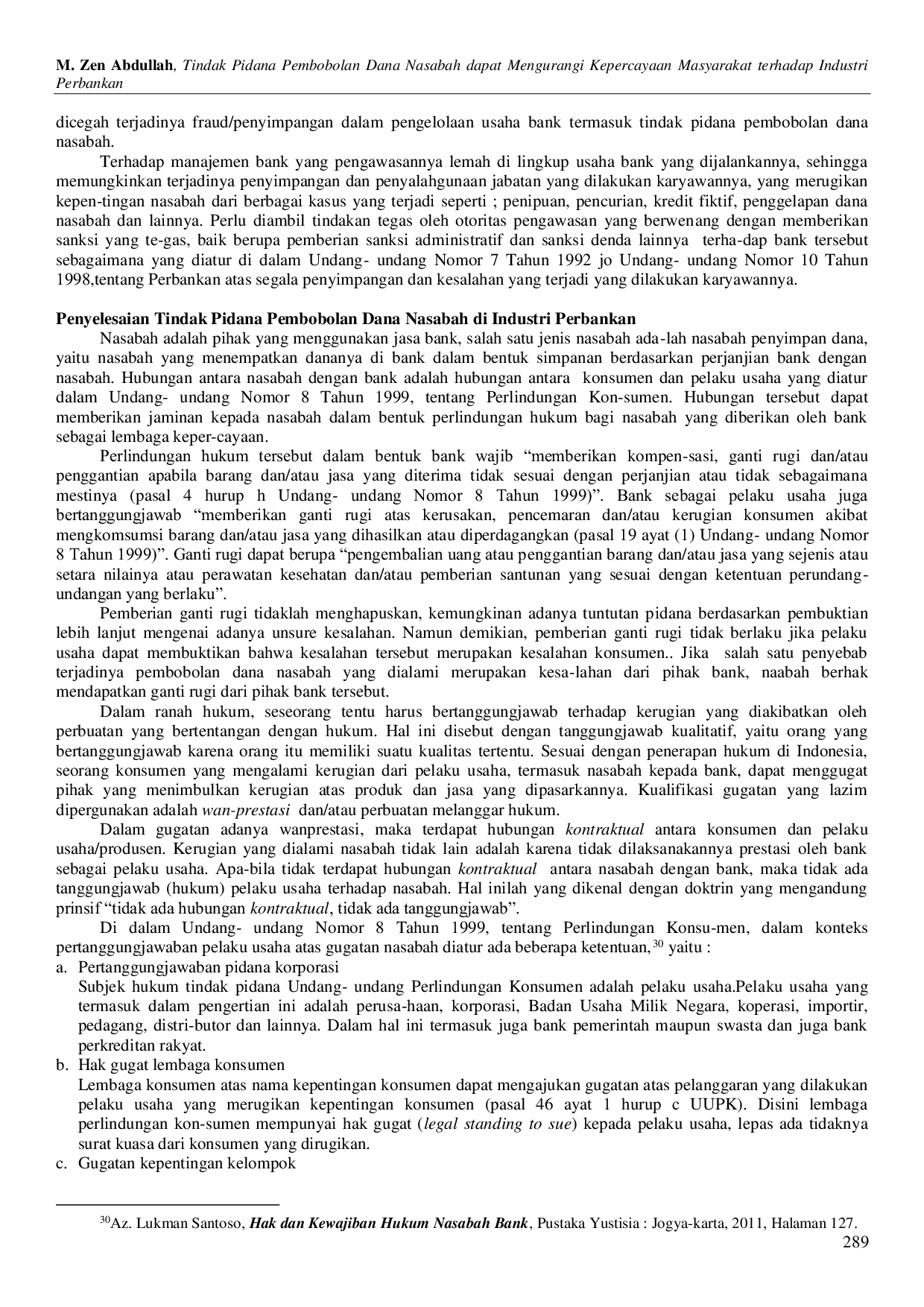 Legalitas: Jurnal HukumLegalitas: Jurnal HukumPerkembangan industri perbankan dengan memasuki era globalisasi dan liberalisasi pasar keuangan saat ini, telah mengakibatkan meningkatnya persaingan di antara bank-bank terutama dalam penghimpunan dana. Untuk itu, manajemen bank dituntut mempunyai ketrampilan mengelola kekayaan, utang dan modal bank yang tercermin dalam neraca bank dengan baik. Suatu hal yang lebih mendasar dari keahlian dan ketrampilan di dalam mengelola bank, diperlukan prinsif kehati-hatian dan diikuti dengan adanya itikad baik pengurus bank, mulai dari dewan komisaris, direksi dan karyawan bank. Artinya, pengurus bank seharusnya adalah pihak yang selalu menjunjung tinggi kode etik perbankan dan mematuhi segala peraturan perundang-undangan yang berlaku di bidang perbankan. Namun dalam praktiknya, tidak selamanya hal itu dapat dijalankan dengan baik adakalahnya tidak tertutupi kemungkinan terjadi penyimpangan yang mengarah pada tindakan fraud dengan melakukan pembobolan dana nasabah yang dilakukan internal bank itu sendiri.