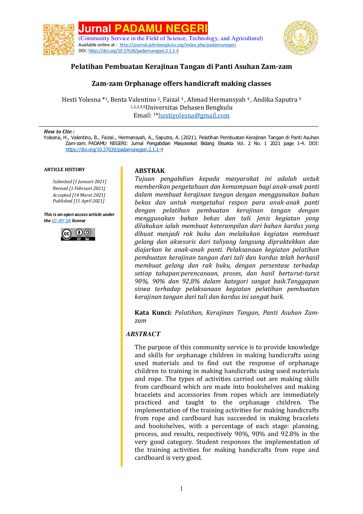 Jurnal PADAMU NEGERI (Pengabdian pada Masyarakat Bidang Eksakta)Jurnal PADAMU NEGERI (Pengabdian pada Masyarakat Bidang Eksakta)Tujuan pengabdian kepada masyarakat ini adalah untuk memberikan pengetahuan dan kemampuan bagi anak-anak panti dalam membuat kerajinan tangan dengan menggunakan bahan bekas dan untuk mengetahui respon para anak-anak panti dengan pelatihan pembuatan kerajinan tangan dengan menggunakan bahan bekas dan tali. Jenis kegiatan yang dilakukan ialah membuat keterampilan dari bahan kardus yang dibuat menjadi rak buku dan melakukan kegiatan membuat gelang dan aksesoris dari tali yang langsung dipraktekkan dan diajarkan ke anak-anak panti. Pelaksanaan kegiatan pelatihan pembuatan kerajinan tangan dari tali dan kardus telah berhasil membuat gelang dan rak buku, dengan persentase terhadap setiap tahapan: perencanaan, proses, dan hasil berturut-turut 90%, 90% dan 92,8% dalam kategori sangat baik. Tanggapan siswa terhadap pelaksanaan kegiatan pelatihan pembuatan kerajinan tangan dari tali dan kardus ini sangat baik.