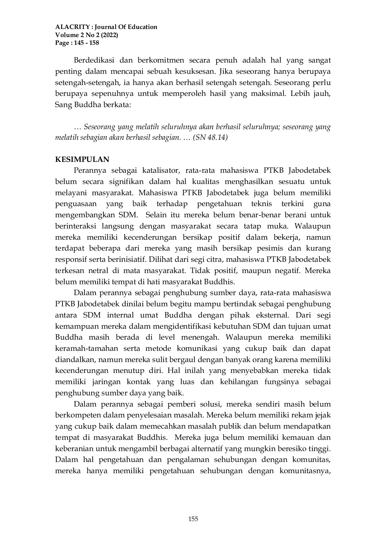 ALACRITY : Journal of EducationALACRITY : Journal of EducationPerkembangan teknologi di berbagai bidang meningkat pesat, menghadirkan persaingan antara individu dan dengan AI. Generasi muda Indonesia cenderung memiliki mindset mediokritas, yang diikuti oleh mahasiswa perguruan tinggi keagamaan Buddha (PTKB) di Jabodetabek. Penelitian ini menggunakan pendekatan kualitatif, melalui wawancara mendalam yang kemudian dianalisis secara heuristik. Hasilnya menunjukkan bahwa rata-rata mahasiswa PTKB di Jabodetabek cenderung medioker dalam perannya sebagai agent of change. Solusi dari mediokritas diperoleh dari kanon-kanon Tipitaka, seperti meningkatkan tekad dan perubahan mindset, serta menemukan lingkungan yang tepat untuk berkembang.