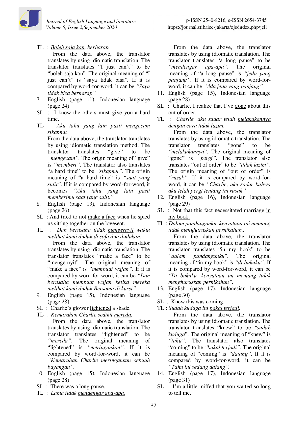 JELL (Journal of English Language and Literature) STIBA-IEC JakartaJELL (Journal of English Language and Literature) STIBA-IEC JakartaTujuan penelitian ini adalah menganalisis metode penerjemahan idiomatik dalam novel “The Twilight Saga Breaking Dawn oleh Stephenie Meyer dan penerjemahannya menjadi bahasa Indonesia dalam buku “Awal yang Baru oleh Monica Dwi Chresnayani. Hasil penelitian menunjukkan bahwa metode penerjemahan yang digunakan oleh penerjemah adalah metode penerjemahan idiomatik berdasarkan teori Newmark. Dalam proses penerjemahan, penerjemah memperhatikan makna sumber bahasa agar pesan dalam bahasa target dapat diterima oleh pembaca.