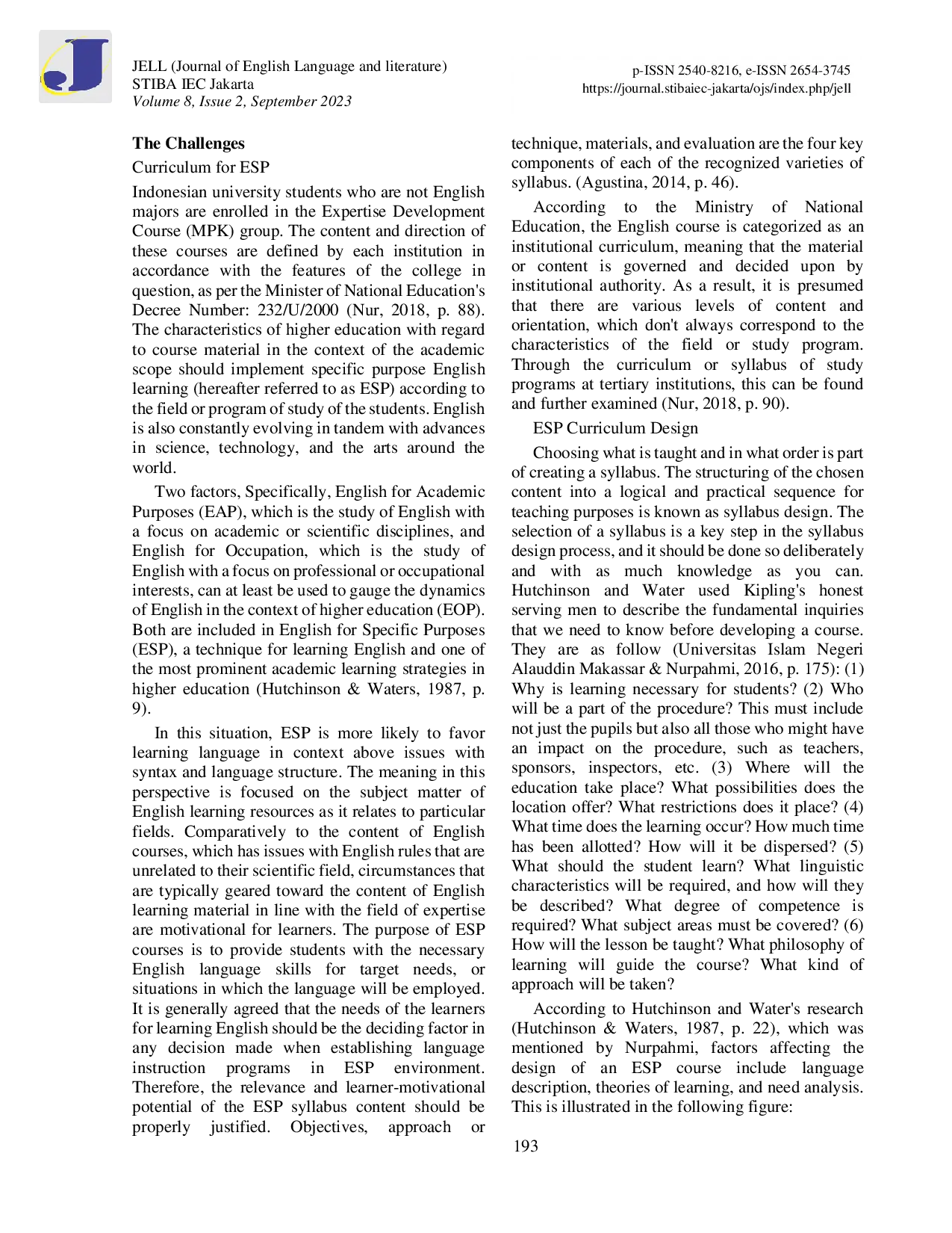 JELL (Journal of English Language and Literature) STIBA-IEC JakartaJELL (Journal of English Language and Literature) STIBA-IEC JakartaIstilah English for Specific Purposes (ESP) mengacu pada metode pengajaran Bahasa Inggris yang berpusat pada tujuan dan kebutuhan pembelajar. Pendekatan ESP merupakan pilihan populer dalam konteks pembelajaran Bahasa Inggris di Indonesia, baik di perguruan tinggi maupun universitas, khususnya bagi mahasiswa di luar jurusan Bahasa Inggris. Metode ini juga selaras dengan kebijakan pemerintah di bidang pendidikan, yang menekankan tujuan pembelajaran Bahasa Inggris, yaitu meningkatkan kemampuan siswa dalam menggunakan Bahasa Inggris, terutama untuk kebutuhan akademik dan karier profesional dengan penekanan pada keterampilan membaca yang memungkinkan siswa memahami materi otentik terkait bidang studi mereka secara efektif. Penelitian ini menggunakan studi pustaka, yang mengumpulkan dokumentasi luas mengenai satu atau sejumlah topik. Sumber primer dan sekunder digunakan dalam penelitian ini. Artikel ini menyajikan penelitian teoretis mengenai perkembangan dan tantangan berikut: Gagasan Dasar Mengenai English for Specific Purposes (ESP); Fungsi Analisis Kebutuhan dalam ESP; ESP sebagai Metode Pengajaran Bahasa; Kurikulum untuk ESP; Desain Kurikulum ESP dan Tujuan Pengajaran ESP.