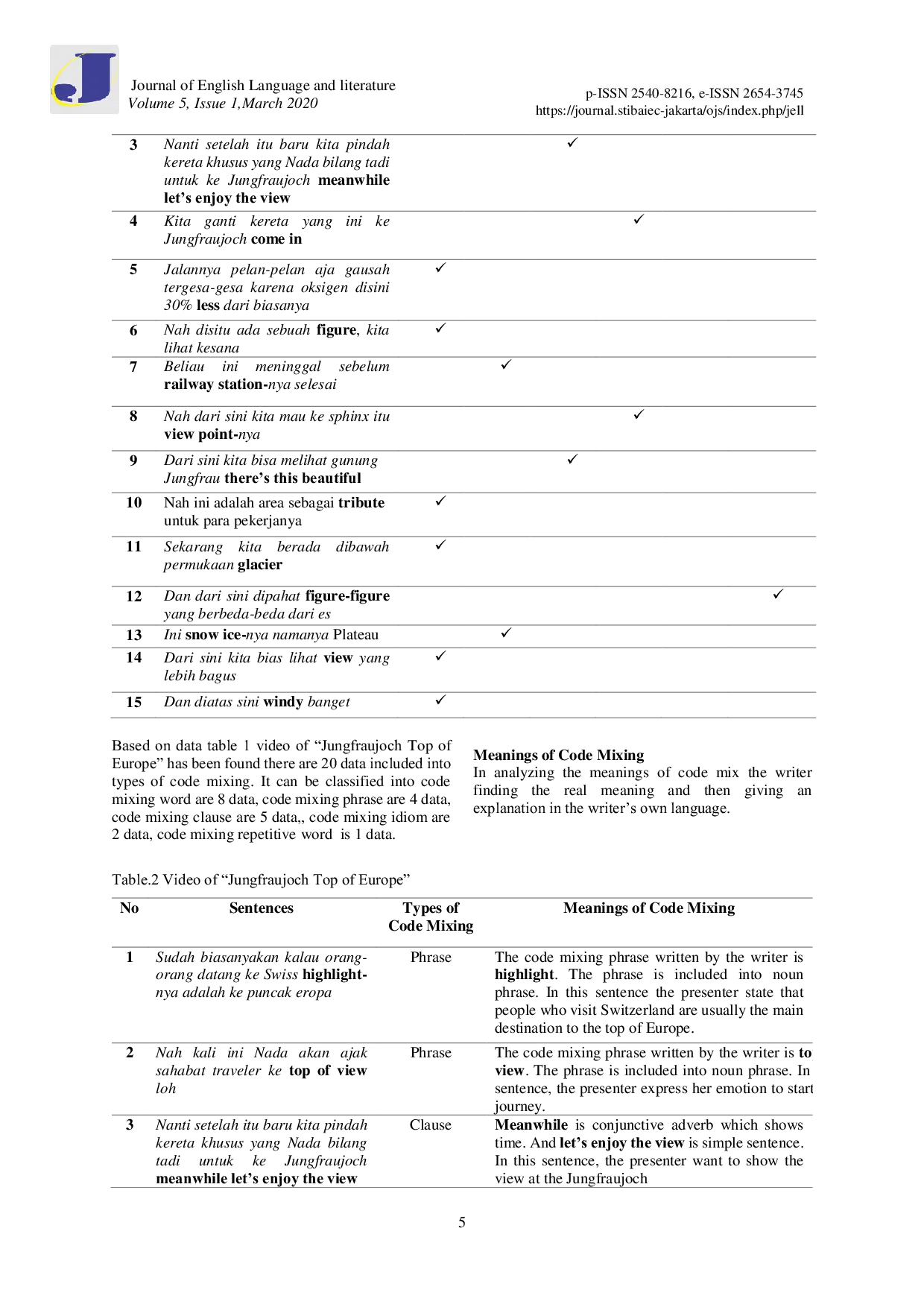 JELL (Journal of English Language and Literature) STIBA-IEC JakartaJELL (Journal of English Language and Literature) STIBA-IEC JakartaCode mixing is a common phenomenon where speakers blend two or more languages within a single utterance. This study investigates code mixing in the Hijab Traveling television program on Trans7. Employing descriptive qualitative research, the study analyzes utterances delivered by the presenter, categorizing mixed code types based on Suwitos theory (insertion of words, phrases, clauses, repetition, and idioms) and identifying the underlying causes using Basirs theory. The findings reveal frequent code mixing, with 15 instances classified into linguistic elements and 9 instances attributed to factors such as language dominance and presenter proficiency. The study concludes that presenters on Hijab Traveling often interweave codes due to their multilingual abilities and extensive knowledge.