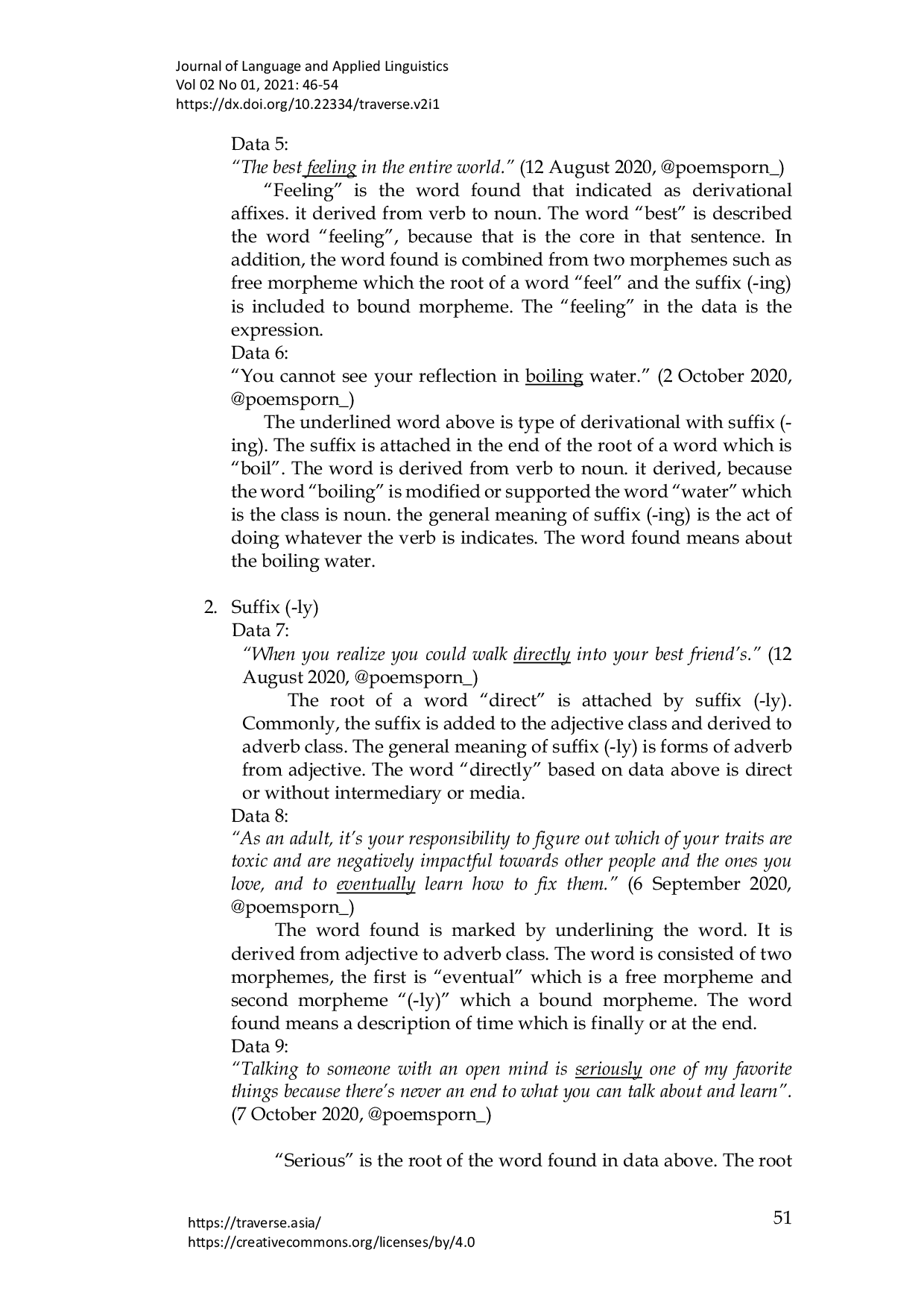 Morfem dapat dibagi menjadi dua tipe, yaitu morfem bebas yang dapat berdiri sendiri dan morfem terikat yang memerlukan afiks.afiks derivatif merupakan morfem terikat yang terdiri dari prefiks dan sufiks, dengan prefiks berada di awal dan sufiks di akhir akar kata.Berdasarkan temuan, lebih dari 30 kata pada postingan Instagram @poemsporn_ mengandung afiks derivatif, meliputi prefiks (Im-, a-, In-, Un-) serta sufiks (-ing, -ly, -ness, -or, -ful, -less, -ion, -ance), dengan fungsi mayoritas berupa perubahan kelas (class‑changing) dan sedikit yang mempertahankan kelas (class‑maintaining).Penulis berharap penelitian ini dapat memperluas pemahaman pembaca tentang afiks derivatif dan mengurangi kesalahan penggunaan afiks dalam pembentukan kata.