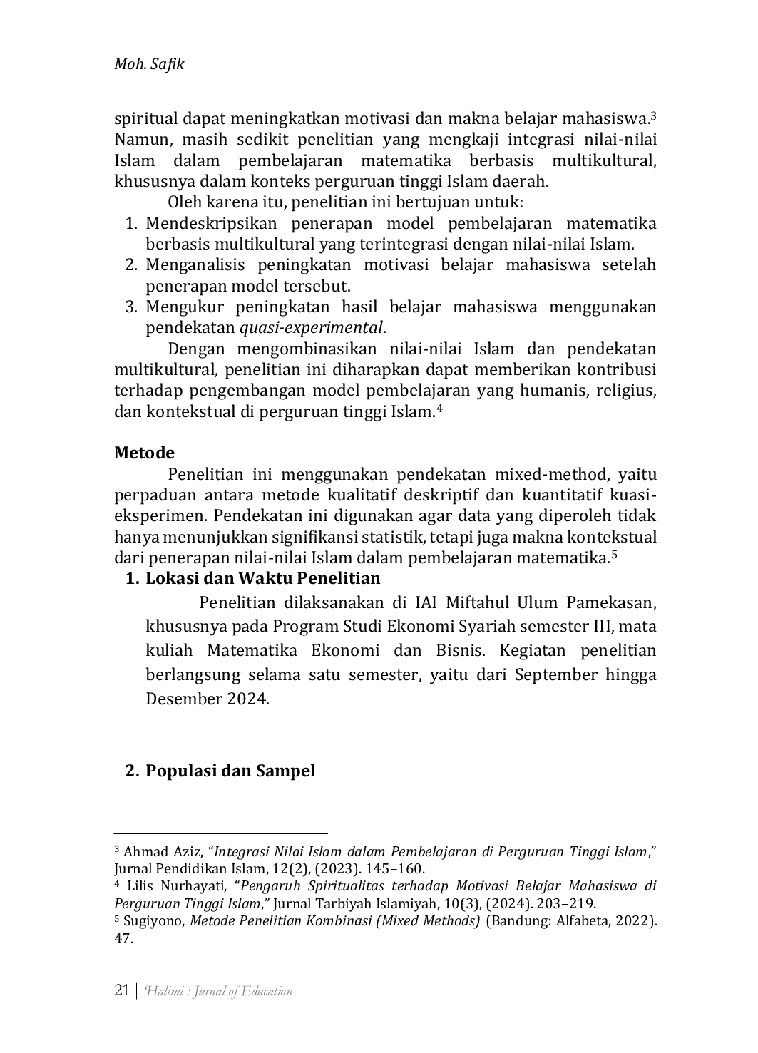 Halimi: Journal of EducationHalimi: Journal of EducationPenelitian ini bertujuan untuk menganalisis pengaruh integrasi nilai-nilai Islam dalam model pembelajaran matematika berbasis multikultural terhadap peningkatan motivasi dan hasil belajar mahasiswa. Penelitian ini menggunakan metode mixed-method dengan desain kuasi-eksperimen dan pendekatan kualitatif deskriptif. Populasi penelitian melibatkan 60 mahasiswa semester III Program Studi Ekonomi Syariah di IAI Miftahul Ulum Pamekasan pada mata kuliah Matematika Ekonomi dan Bisnis. Instrumen penelitian meliputi angket motivasi belajar, tes hasil belajar (pretest dan posttest), serta wawancara mendalam. Hasil penelitian menunjukkan bahwa penerapan pembelajaran matematika yang diintegrasikan dengan nilai-nilai Islam dan konteks multikultural mampu meningkatkan motivasi mahasiswa sebesar 25,4% dan hasil belajar sebesar 31,7%. Uji t menunjukkan terdapat perbedaan signifikan antara nilai pretest dan posttest (t = 7,45; p < 0,05). Integrasi nilai-nilai Islam melalui ayat-ayat Al-Quran tentang keseimbangan, keadilan, dan kejujuran dalam konteks ekonomi terbukti memperkuat makna pembelajaran dan menumbuhkan kesadaran spiritual mahasiswa terhadap ilmu matematika.
