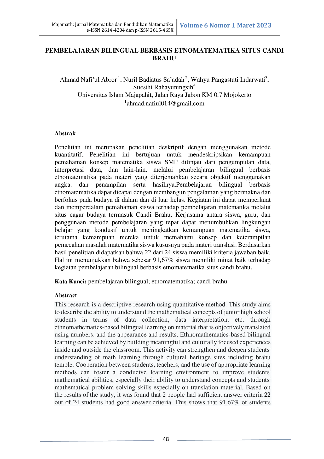 Penelitian selanjutnya dapat meneliti bagaimana penggunaan situs warisan budaya lain di daerah Jawa Timur, selain Candi Brahu, memengaruhi efektivitas pembelajaran matematika dwibahasa berbasis etnomatematika pada siswa SMP, dengan membandingkan hasil belajar dan minat siswa di masing‑misnya. Selanjutnya, penting untuk mengkaji sejauh mana pemahaman konsep matematika yang diperoleh melalui pendekatan tersebut dapat dipertahankan dalam jangka panjang, misalnya dengan melakukan tes retensi setelah tiga hingga enam bulan dibandingkan dengan pembelajaran konvensional. Selain itu, penelitian dapat mengeksplorasi penerapan teknologi realitas tertambah (augmented reality) yang menampilkan model‑model tiga dimensi situs budaya selama proses belajar, untuk menilai apakah interaksi digital meningkatkan motivasi, pemahaman bahasa, dan kemampuan pemecahan masalah siswa. Hasil dari studi‑studi tersebut dapat menjadi dasar kebijakan pendidikan yang menekankan integrasi budaya lokal dalam kurikulum matematika nasional.