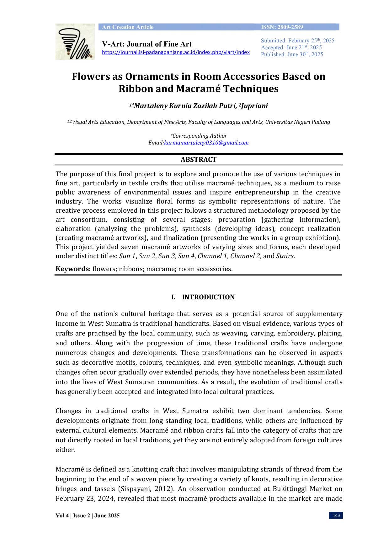 V-art: Journal of Fine ArtV-art: Journal of Fine ArtTujuan dari proyek akhir ini adalah untuk mengeksplorasi dan mempromosikan penggunaan berbagai teknik dalam seni rupa, khususnya dalam kerajinan tekstil yang menggunakan teknik macramé, sebagai media untuk meningkatkan kesadaran publik terhadap isu-isu lingkungan dan menginspirasi kewirausahaan di industri kreatif. Karya-karya tersebut merepresentasikan bentuk bunga sebagai simbol alam. Proses kreatif yang digunakan mengikuti metodologi terstruktur yang diajukan oleh konsorsium seni, yang terdiri dari beberapa tahap: persiapan (pengumpulan informasi), elaborasi (analisis masalah), sintesis (pengembangan ide), realisasi konsep (pembuatan karya macramé), dan finalisasi (pameran karya secara kelompok). Proyek ini menghasilkan tujuh karya macramé dengan berbagai ukuran dan bentuk, masing-masing dikembangkan dengan judul berbeda: Sun 1, Sun 2, Sun 3, Sun 4, Channel 1, Channel 2, dan Stairs.