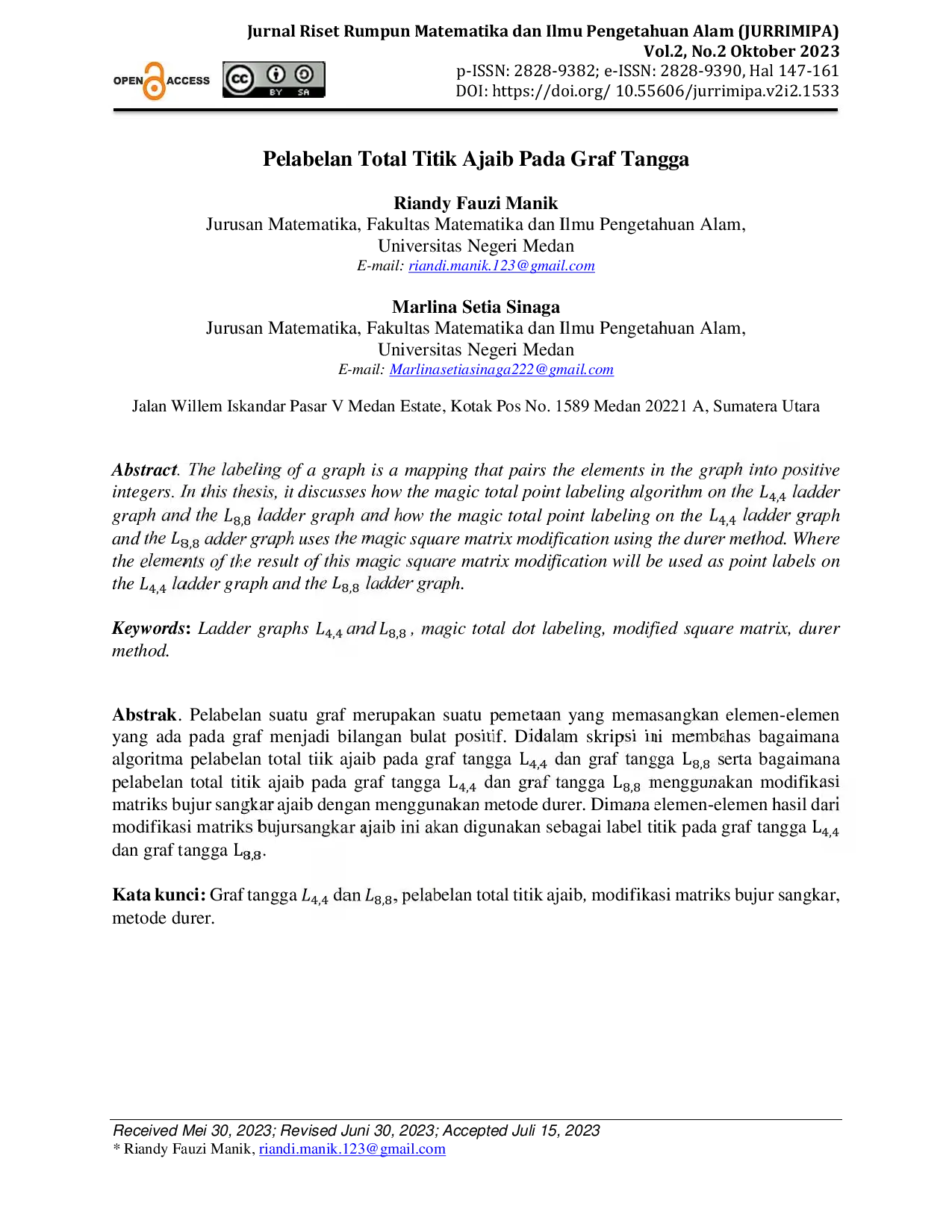JURNAL RISET RUMPUN MATEMATIKA DAN ILMU PENGETAHUAN ALAMJURNAL RISET RUMPUN MATEMATIKA DAN ILMU PENGETAHUAN ALAMPelabelan suatu graf merupakan suatu pemetaan yang memasangkan elemen-elemen yang ada pada graf menjadi bilangan bulat positif. Didalam skripsi ini membahas bagaimana algoritma serta bagaimana menggunakan modifikasi matriks bujur sangkar ajaib dengan menggunakan metode durer. Dimana elemen-elemen hasil dari modifikasi matriks bujursangkar ajaib ini akan digunakan sebagai label titik pada graf tangga dan graf tangga dan graf tangga dan graf tangga.