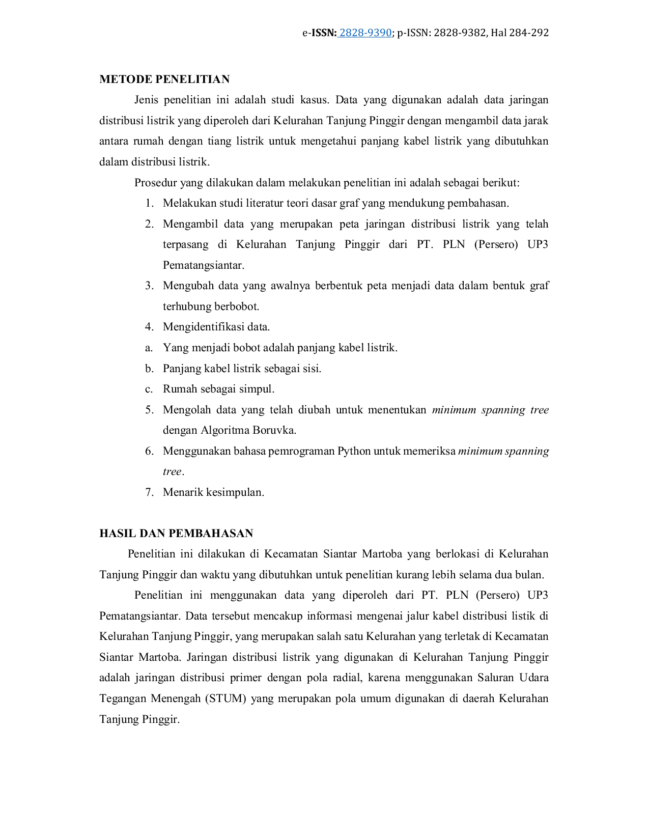 JURNAL RISET RUMPUN MATEMATIKA DAN ILMU PENGETAHUAN ALAMJURNAL RISET RUMPUN MATEMATIKA DAN ILMU PENGETAHUAN ALAMPenelitian ini dilakukan di Tanjung Pinggir, Siantar Martoba untuk mengetahui optimalisasi instalasi listrik menggunakan algoritma Boruvka untuk mencari simpul pohon merentang minimal dengan jumlah minimal 3 simpul berturut-turut. Tepi yang tidak membentuk sirkuit. Berdasarkan data yang diperoleh dari PT. PLN (Persero) UP3 Pematangsiantar, kemudian didapatkan gambar graf jaringan yang terpasang. Hasil yang diperoleh untuk diagram instalasi listrik diperoleh dengan menggunakan Python dan algoritma Boruvka 2.591 meter untuk mendapatkan pohon merentang minimum. Dalam hal ini, kabel distribusi listrik berkurang 41 meter dibandingkan total pemasangan sebelumnya sebanyak 2.632 meter.