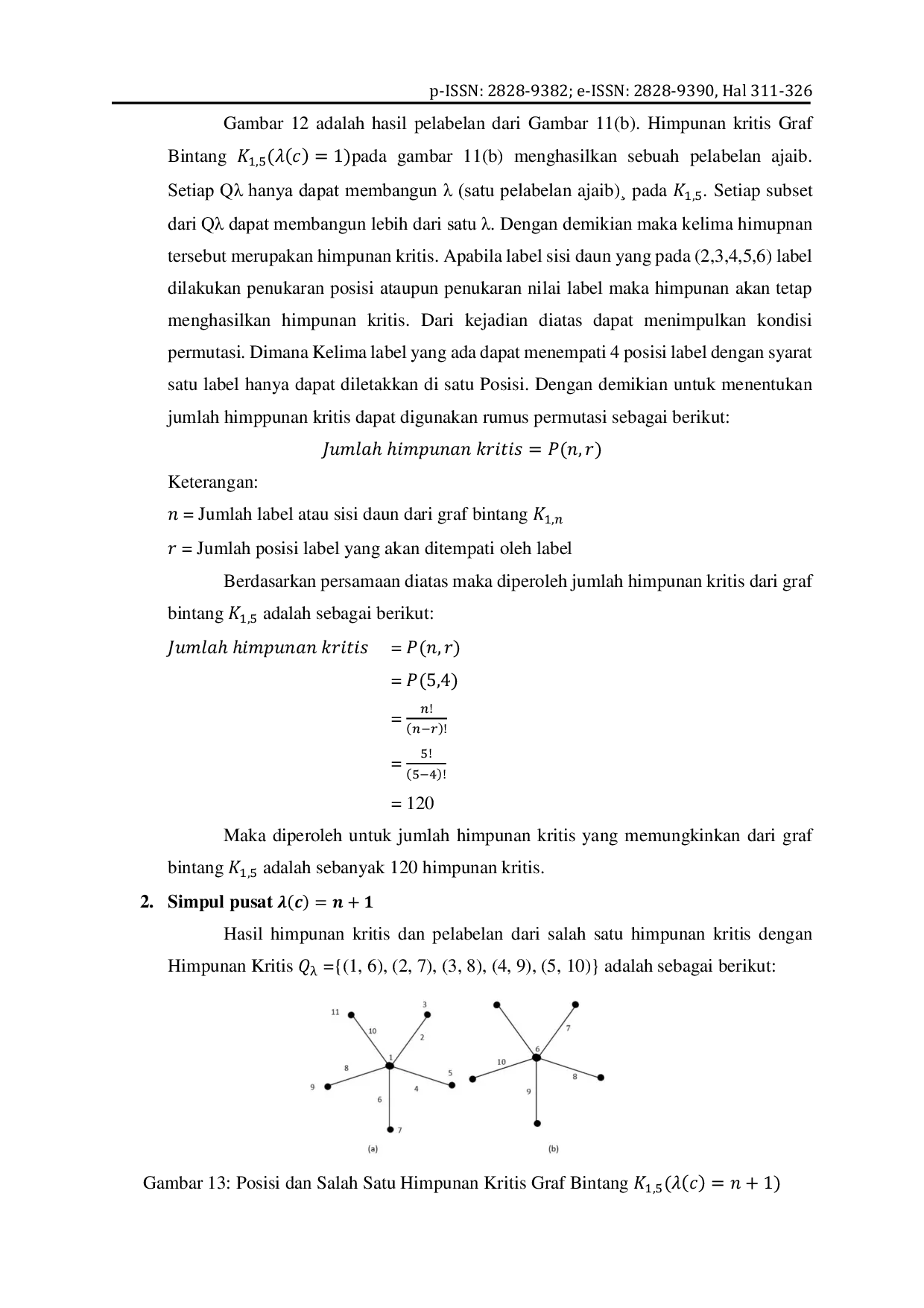 JURNAL RISET RUMPUN MATEMATIKA DAN ILMU PENGETAHUAN ALAMJURNAL RISET RUMPUN MATEMATIKA DAN ILMU PENGETAHUAN ALAMPelabelan adalah pemetaan satu-satu yang memetakan setiap elemen dari graf ke bilangan positif yang dinamakan dengan label. Salah jenisnya yaitu pelabelan total sisi-ajaib. Dalam kondisi khusus himpunan hasil dari pelabelan graf yang subhimpunan label dan posisinya, yang membangun graf yang sama dengan pelabelannya tersebut secara tunggal disebut dengan himpunan kritis. Untuk memperoleh himpunan kritis dari suatu graf kita harus mengetahui jenis graf tersebut. Pada penelitian ini adalah graf bintang. Penelitian ini bertujuan untuk menentukan . Graf bintang yang digunakan adalah graf bintang K1,5 dengan menggunakan titik pusat 1, n 1 dan 2n 1. Hasil penelitian menunjukkan pada pelabelan total sisi ajaib Graf Bintang K1,5 dengan titik pusat λ(c) = 1 diperoleh bilangan ajaib k=14. Himpunan kritis graf K1,5 yang memungkinkan sebanyak 120. Pada Graf Bintang K1,5 dengan titik pusat λ(c) = n 1 diperoleh bilangan ajaib k=18. Himpunan kritis graf K1,5 yang memungkinkan sebanyak 120. Pada Graf Bintang K1,5 dengan titik pusat λ(c) = 2n 1 diperoleh bilangan ajaib k=22. Himpunan kritis graf K1,5 yang memungkinkan sebanyak 120.