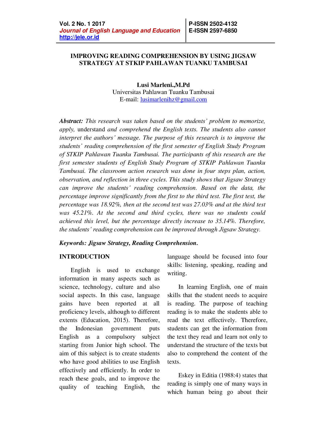 Journal of English Language and EducationJournal of English Language and EducationThis research was taken based on the students problem to memorize, apply, understand and comprehend the English texts. The students also cannot interpret the authors message. The purpose of this research is to improve the students reading comprehension of the first semester of English Study Program of STKIP Pahlawan Tuanku Tambusai. The participants of this research are the first semester students of English Study Program of STKIP Pahlawan Tuanku Tambusai. The classroom action research was done in four steps plan, action, observation, and reflection in three cycles. This study shows that Jigsaw Strategy can improve the students reading comprehension. Based on the data, the percentage improve significantly from the first to the third test. The first test, the percentage was 18.92%, then at the second test was 27.03% and at the third test was 45.21%. At the second and third cycles, there was no students could achieved this level, but the percentage directly increase to 35.14%. Therefore, the students reading comprehension can be improved through Jigsaw Strategy.