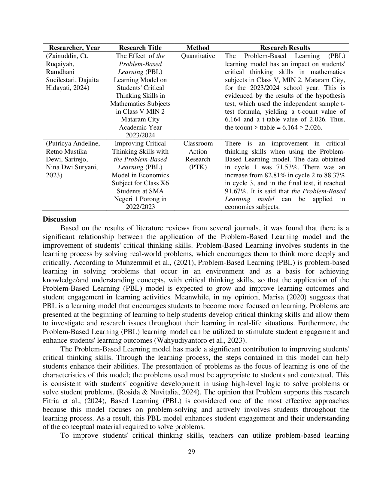 Hasil penelitian ini menunjukkan bahwa penerapan model Problem-Based Learning (PBL) memiliki dampak signifikan terhadap pengembangan keterampilan berpikir kritis siswa.Model pembelajaran ini menekankan pemecahan masalah kolaboratif di dunia nyata dan dapat mendorong siswa untuk lebih aktif dalam menganalisis, mengevaluasi, dan mensintesis informasi.Dengan melibatkan siswa dalam situasi yang membutuhkan pemecahan masalah, PBL memupuk pengembangan keterampilan berpikir kritis yang esensial untuk menghadapi tantangan masa depan dalam kehidupan dan dunia kerja.