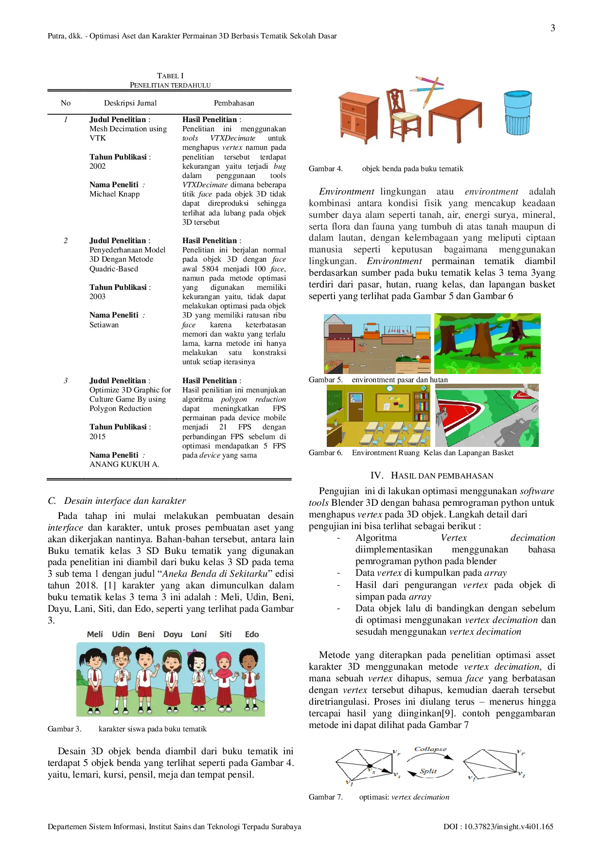 Journal of Information System,Graphics, Hospitality and TechnologyJournal of Information System,Graphics, Hospitality and TechnologyPembelajaran tematik merupakan pembelajaran terpadu yang menggunakan tema sebagai pokok pikiran. Penelitian ini menggunakan buku Tematik Sekolah Dasar Kelas 3 tema 3 sebagai referensi untuk merancang repository asset dan karakter permainan 3D berbasis optimasi karakter dan objek 3D menggunakan metode vertex decimation. Hasil penelitian menunjukkan bahwa jumlah vertex pada karakter udin setelah di optimasi berjumlah 418.175 dan 20.473 vertex untuk karakter meli, aset objek 3D setelah di optimasi didapatkan 36.070 vertex. Optimasi menghasilkan perbedaan sebesar 26,7% tanpa signifikan mengurangi detail objek.