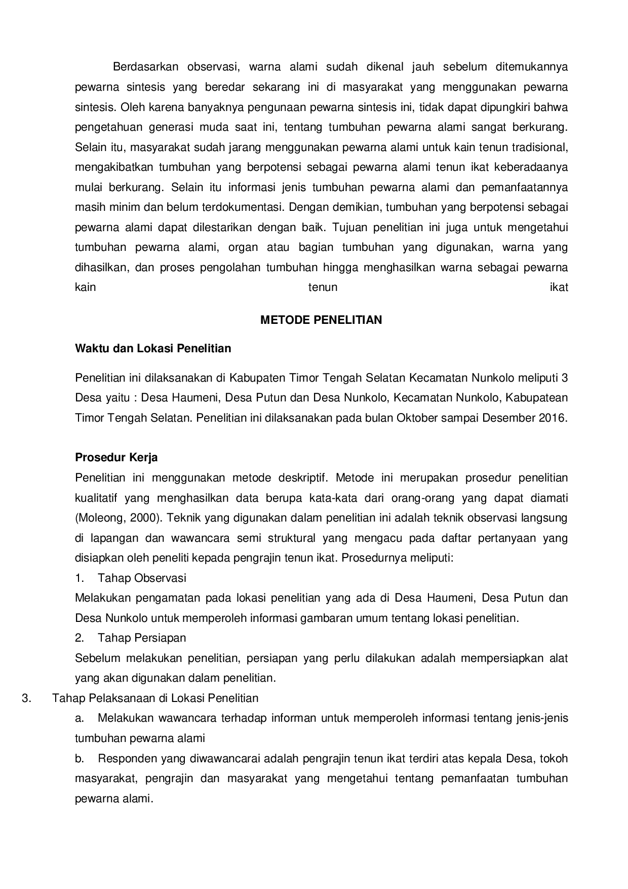 INDIGENOUS BIOLOGI : JURNAL PENDIDIKAN DAN SAINS BIOLOGIINDIGENOUS BIOLOGI : JURNAL PENDIDIKAN DAN SAINS BIOLOGIPenelitian ini bertujuan untuk mengetahui tumbuhan pewarna alami, organ tumbuhan yang digunakan, warna yang dihasilkan, dan proses pengolahan tumbuhan hingga menghasilkan warna. Metode yang digunakan adalah metode deskriptif kualitatif dengan teknik observasi dan wawancara semi struktural. Penelitian ini dilakukan pada masyarakat Desa Haumeni, Desa Putun dan Desa Nunkolo, Kecamatan Nunkolo, Kabupaten Timor Tengah Selatan. Jumlah informen dalam penelitian ini 30 orang yang terdiri atas kepala Desa, tokoh masyarakat, pengrajin dan masyarakat yang mengetahui tentang pemanfaatan tumbuhan pewarna alami. Hasil penelitian diperoleh 5 jenis tumbuhan pewarna alami yaitu rimpang dari famili Zingiberaceace yaitu Kunyit/Huki (Curcuma domestica L) menghasilkan warna kuning yang diolah dengan cara ditumbuk, warna merah dihasilkan dari kulit batang famili Rubiaceace yakni Mengkudu/Baokulu (Morinda citrifolia L) yang direbus, warna hijau dihasilkan dari famili Fabaceace yakni daun kacang Arbila/Koto (Phaseolus lunatus L) yang ditumbuk, warna hitam dihasilkan dari famili Rubiaceace yakni daun Tarum/Taum (Indigofera tinctoria L) yang direndam, dari famili Euphorbiaceae yang diambil adalah daun Pohon Buah Tinta/Meko (Phylantus reticulatus Poir) untuk warna biru diolah dengan direndam dan dicampuran tepung jagung, Selain itu terdapat tumbuhan yang digunakan sebagai bahan tambahan dalam pewarnaan yaitu daging buah kelapa/Noa (Cocos nucifera) dan kapur sirih. Tumbuhan yang digunakan dalam proses perendaman awal adalah Kemiri/Fenu (Aleurites mollucana L) dan Jagung/Pena (Zea Mays L). Tujuan penambahan kapur adalah sebagai penguat warna sehingga tidak mudah luntur. Tumbuhan yang berpotensi sebagai pewarna alami tenun ikat sebagian besar telah dibudidayakan. Tumbuhan yang dibudidayakan adalah Tarum, Kunyit dan kacang Arbila.