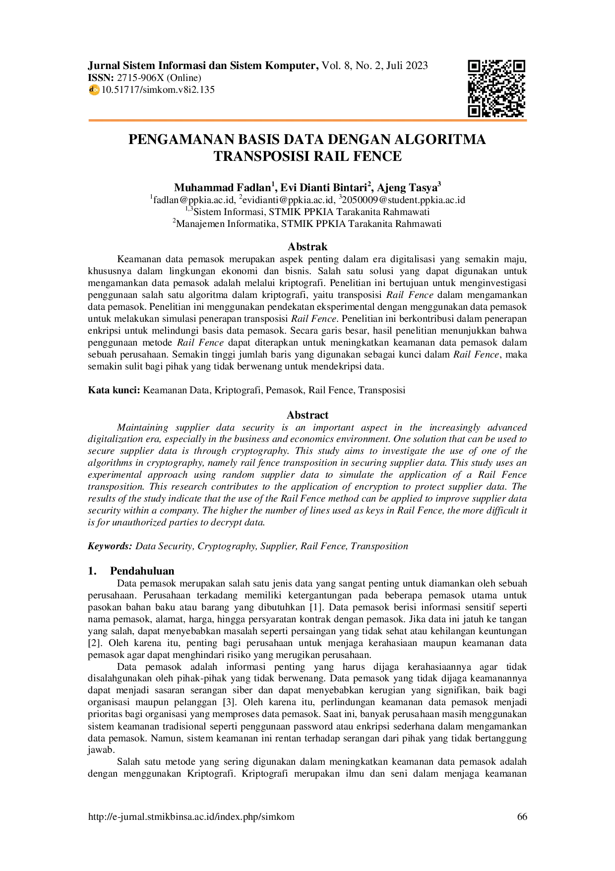 Berdasarkan penelitian yang telah dilakukan dapat disimpulkan bahwa pemanfaatan ilmu kriptografi melalui transposisi Rail Fence dapat dilakukan untuk mengamankan basis data pemasok dalam sebuah perusahaan.Pemanfaatan Rail Fence tersebut juga berhasil melakukan proses enkripsi basis data pemasok menjadi teks teracak dan mengembalikannya dalam bentuk semula melalui proses dekripsi.Implikasi dari penelitian ini adalah bahwa perusahaan dapat mempertimbangkan penggunaan metode Rail Fence sebagai salah satu langkah untuk meningkatkan keamanan data pemasok.