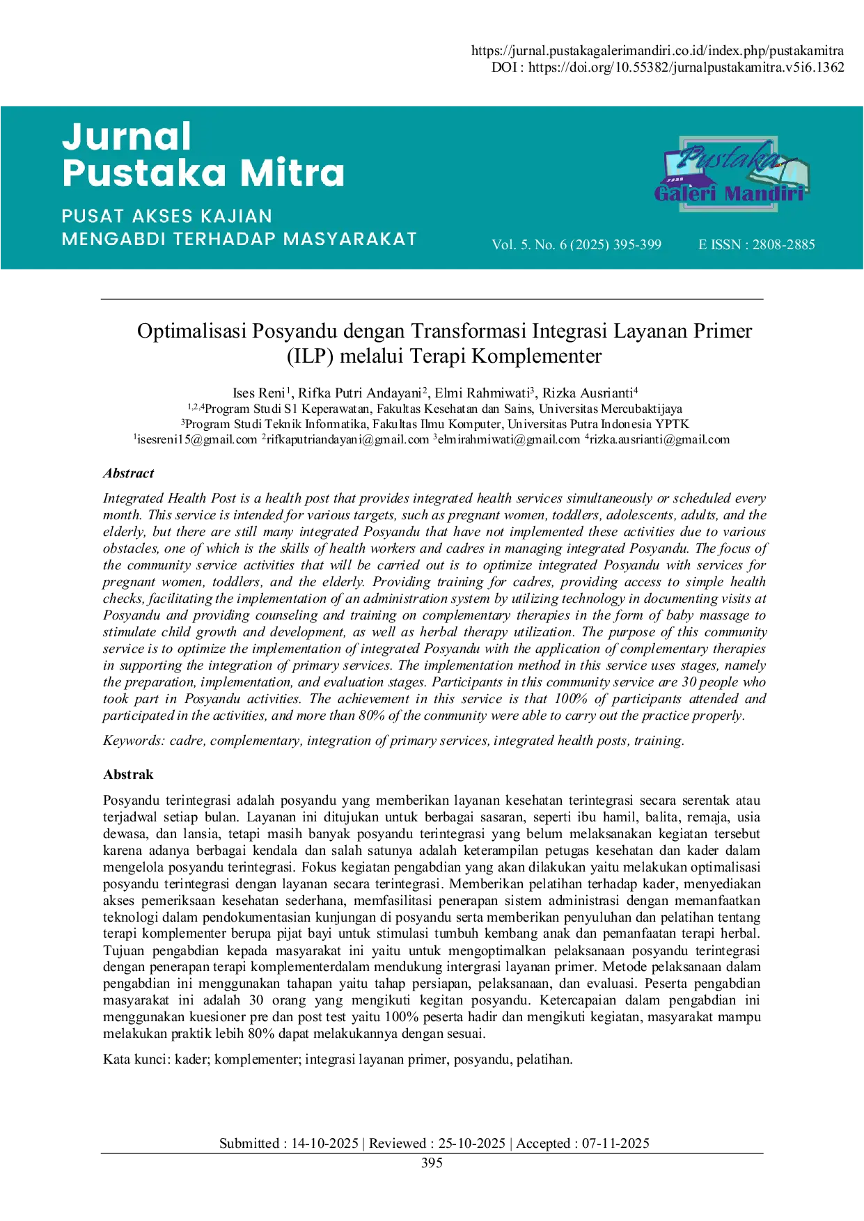 Jurnal Pustaka Mitra (Pusat Akses Kajian Mengabdi Terhadap Masyarakat)Jurnal Pustaka Mitra (Pusat Akses Kajian Mengabdi Terhadap Masyarakat)Posyandu terintegrasi adalah posyandu yang memberikan layanan kesehatan terintegrasi secara serentak atau terjadwal setiap bulan. Layanan ini ditujukan untuk berbagai sasaran, seperti ibu hamil, balita, remaja, usia dewasa, dan lansia, tetapi masih banyak posyandu terintegrasi yang belum melaksanakan kegiatan tersebut karena adanya berbagai kendala dan salah satunya adalah keterampilan petugas kesehatan dan kader dalam mengelola posyandu terintegrasi. Fokus kegiatan pengabdian yang akan dilakukan yaitu melakukan optimalisasi posyandu terintegrasi dengan layanan secara terintegrasi. Memberikan pelatihan terhadap kader, menyediakan akses pemeriksaan kesehatan sederhana, memfasilitasi penerapan sistem administrasi dengan memanfaatkan teknologi dalam pendokumentasian kunjungan di posyandu serta memberikan penyuluhan dan pelatihan tentang terapi komplementer berupa pijat bayi untuk stimulasi tumbuh kembang anak dan pemanfaatan terapi herbal. Tujuan pengabdian kepada masyarakat ini yaitu untuk mengoptimalkan pelaksanaan posyandu terintegrasi dengan penerapan terapi komplementer dalam mendukung integrasi layanan primer. Metode pelaksanaan dalam pengabdian ini menggunakan tahapan yaitu tahap persiapan, pelaksanaan, dan evaluasi. Peserta pengabdian masyarakat ini adalah 30 orang yang mengikuti kegitan posyandu. Ketercapaian dalam pengabdian ini menggunakan kuesioner pre dan post test yaitu 100% peserta hadir dan mengikuti kegiatan, masyarakat mampu melakukan praktik lebih 80% dapat melakukannya dengan sesuai.