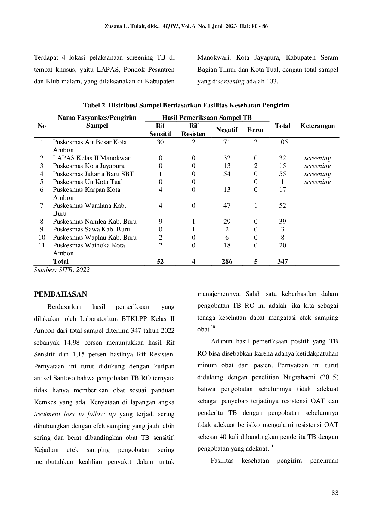 Miracle Journal of Public HealthMiracle Journal of Public HealthPenyakit Tuberkulosis (TB) masih merupakan masalah kesehatan yang menjadi beban global. Indonesia merupakan negara peringkat ketiga di dunia dengan beban TB tertinggi, dan di Kota Ambon pada tahun 2022 terdapat 1296 penderita TB. Tujuan penelitian ini adalah untuk menggambarkan situasi penyakit TB berbasis surveilans laboratorium di wilayah layanan BTKLPP Ambon selama tahun 2022. Kegiatan ini merupakan riset operasional yang memantau dan mengevaluasi hasil pemeriksaan spesimen TB yang dikirimkan oleh fasyankes maupun yang diambil sendiri oleh petugas BTKLPP Ambon dalam kegiatan screening penyakit TB di tempat-tempat khusus. Bahan dan alat yang digunakan dalam pemeriksaan spesimen TB antara lain sputum, TCM GeneXpert-TB, dan bahan penunjang lainnya. Hasil pemeriksaan spesimen TB ini dicatat dalam Sistim Informasi TB (SITB) yang merupakan alat surveilans TB yang digunakan untuk memantau kasus TB di Indonesia. Hasil penelitian ini menemukan dari jumlah 347 sampel TB yang diperiksa, 15% merupakan TB sensitif obat, 1% TB resisten Rifampicin, 2% error, dan 82% negatif. Kesimpulannya yaitu masih ditemukan adanya TB sensitif obat dan TB resisten di wilayah layanan BTKLPP Ambon. Kegiatan ini perlu dilanjutkan agar kasus TB di wilayah layanan dapat tetap terpantau.