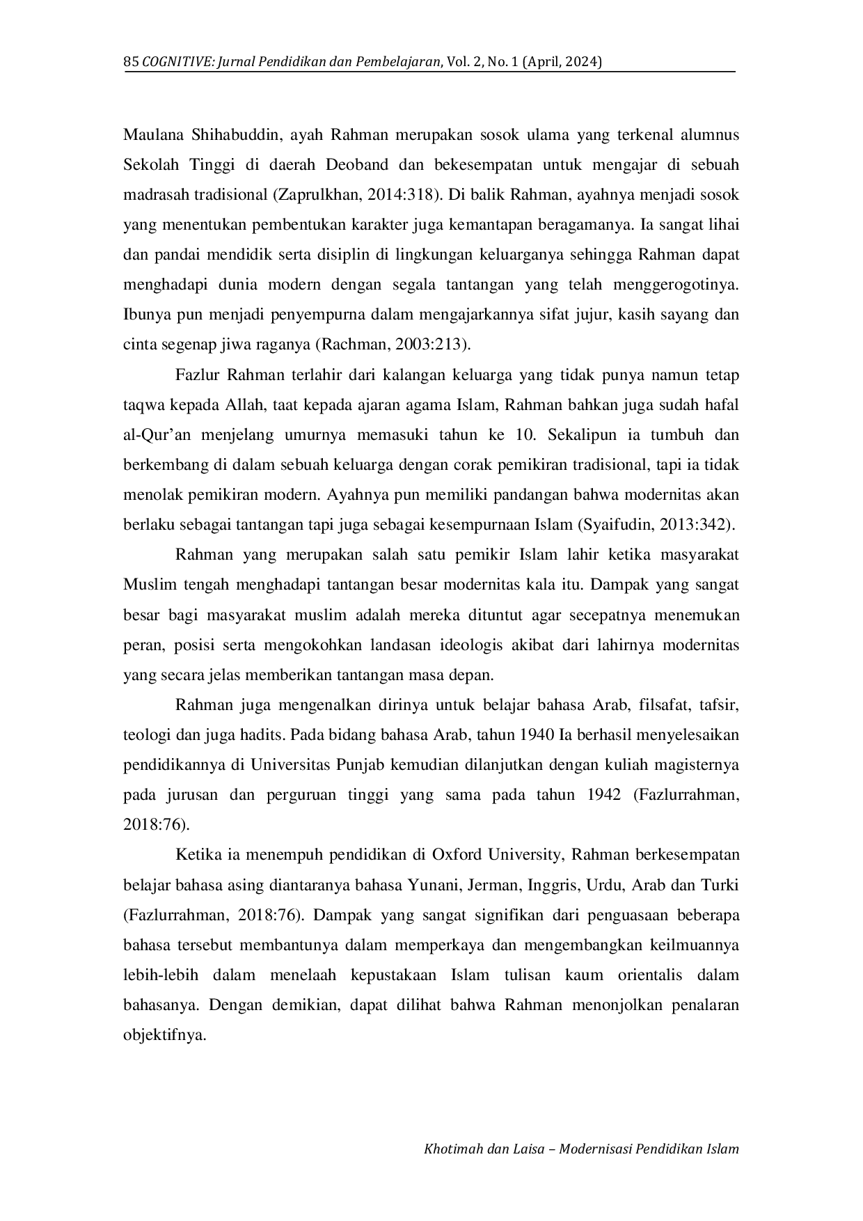 Cognitive: Jurnal Pendidikan dan PembelajaranCognitive: Jurnal Pendidikan dan PembelajaranFazlur Rahman merupakan salah satu sosok pemikir pendidikan bercorak neomodernis yang menguasai keilmuan Islam pada masa klasik namun juga ia melek ilmu-ilmu modern. Pendidikan yang menaungi pemikiran neo-modernisme ini meliputi dua corak yaitu corak tradisional dan corak modern yang memiliki karakter jauh berbeda. Pembaharuan/modernisasi pendidikan Islam dalam kacamata Rahman bisa dilaksanakan dengan cara sekuler modern diterima kemudian berupaya untuk mendalaminya dengan konsep-konsep bernafaskan Islam dengan beberapa cara, diantaranya: menghidupkan kembali ideologi muslim mengenai pentingnya menuntut ilmu serta mengembangkannya, berupaya untuk mengikis adanya dualisme dalam sistem pendidikan Islam, perlunya kesadaran tentang pentingnya bahasa dalam dunia pendidikan, melakukan pembaharuan pada bidang metode pendidikan Islam dan memberikan materi ilmu sosial khususnya filsafat di dunia pendidikan Islam. Fazlur Rahman sebagai sosok pemikir neo-modernis terlihat pada pengaplikasian pemikiran pendidikan tujuan pendidikan, sistem pendidikan, konsep peserta didik, konsep pendidik dan juga sarana pendidikannya.