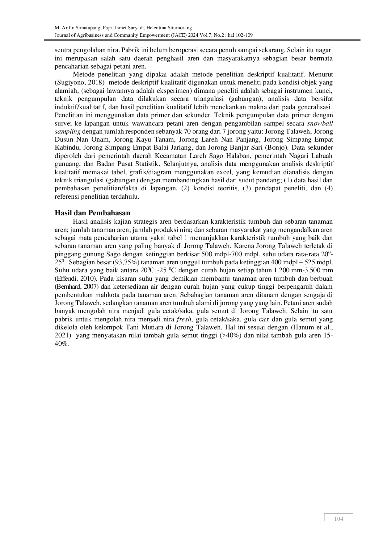 Journal of Agribusiness and Community Empowerment (JACE)Journal of Agribusiness and Community Empowerment (JACE)Tanaman aren merupakan tanaman perkebunan yang mempunyai potensi sebagai penghasil gula. Inventarisasi tanaman aren merupakan kegiatan pengumpulan dan penyusunan data dan fakta yang digunakan untuk perencanaan, pengelolaan dan penelitian lebih lanjut tanaman aren. Tujuan dari penelitian ini adalah untuk melakukan inventarisasi jumlah penduduk, produksi, potensi dan pemanfaatan tanaman aren di Nagari Labuah Gunuang, Kecamatan Lareh Sago Halaban, Kabupaten Lima Puluh Kota. Penelitian menggunakan data primer dan data sekunder. Responden penelitian ini diambil secara berjenjang. Responden petani aren berjumlah 70 orang, berasal dari 7 jorong yang diharapkan dapat mewakili keadaan di Nagari Labuah Gunuang. Teknik pengumpulan data adalah wawancara mendalam dan observasi partisipan. Hasil penelitian kualitatif menekankan pada makna pada generalisasi. Nagari Labuah Gunuang mempunyai potensi tanaman aren yang cukup baik dimana dari 70 responden terdapat 3.266 pohon aren, TM sebanyak 633 pohon pada saat survei lapangan, untuk pengelolaan air nira kualitasnya relatif baik. Potensi penerimaan hasil olahan nira dari produksi nira sebanyak 2.240 liter setara dengan Rp. 5.600.000 jika dijual dalam bentuk air nira murni, Rp. 8.962.000 jika dijual dalam bentuk botol nira fresh, Rp. 6.660.000 dan Rp. 8.325.000 jika dijual dalam bentuk gula aren serta Rp. 11.760.000 jika dijual dalam bentuk gula semut. Pengolahan gula aren yang berkualitas dapat meningkatkan perekonomian petani aren. Masyarakat Nagari Labuah Gunuang mampu mengelola jenis produk lain selain saka/gula aren seperti; gula semut, gula cair, minuman getah segar. Adanya varian produk baru ini mengurangi produksi nira yang dijadikan minuman.