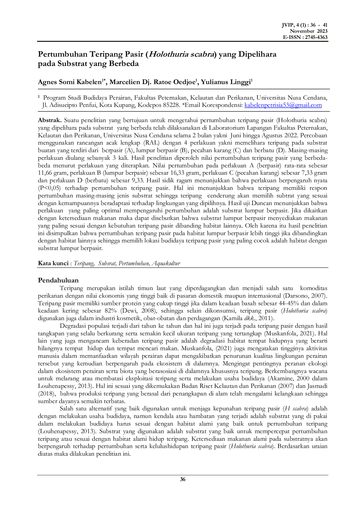 JURNAL VOKASI ILMU-ILMU PERIKANAN (JVIP)JURNAL VOKASI ILMU-ILMU PERIKANAN (JVIP)Suatu penelitian yang bertujuan untuk mengetahui pertumbuhan teripang pasir yang dipelihara pada substrat yang berbeda telah dilaksanakan di Laboratorium Lapangan Fakultas Peternakan, Kelautan dan Perikanan, Universitas Nusa Cendana selama 2 bulan yakni Juni hingga Agustus 2022.