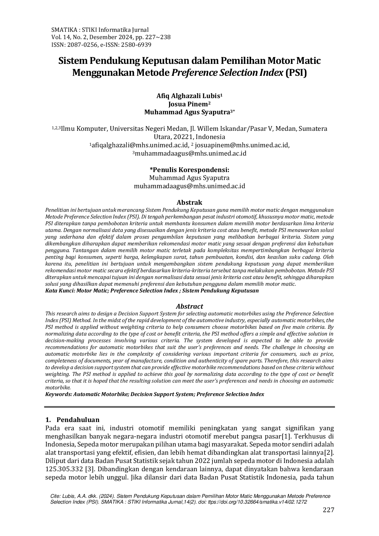 SMATIKA JURNALSMATIKA JURNALPenelitian ini bertujuan untuk merancang Sistem Pendukung Keputusan guna memilih motor matic dengan menggunakan Metode Preference Selection Index (PSI). Di tengah perkembangan pesat industri otomotif, khususnya motor matic, metode PSI diterapkan tanpa pembobotan kriteria untuk membantu konsumen dalam memilih motor berdasarkan lima kriteria utama. Dengan normalisasi data yang disesuaikan dengan jenis kriteria cost atau benefit, metode PSI menawarkan solusi yang sederhana dan efektif dalam proses pengambilan keputusan yang melibatkan berbagai kriteria. Sistem yang dikembangkan diharapkan dapat memberikan rekomendasi motor matic yang sesuai dengan preferensi dan kebutuhan pengguna. Tantangan dalam memilih motor matic terletak pada kompleksitas mempertimbangkan berbagai kriteria penting bagi konsumen, seperti harga, kelengkapan surat, tahun pembuatan, kondisi, dan keaslian suku cadang. Oleh karena itu, penelitian ini bertujuan untuk mengembangkan sistem pendukung keputusan yang dapat memberikan rekomendasi motor matic secara efektif berdasarkan kriteria-kriteria tersebut tanpa melakukan pembobotan. Metode PSI diterapkan untuk mencapai tujuan ini dengan normalisasi data sesuai jenis kriteria cost atau benefit, sehingga diharapkan solusi yang dihasilkan dapat memenuhi preferensi dan kebutuhan pengguna dalam memilih motor matic.