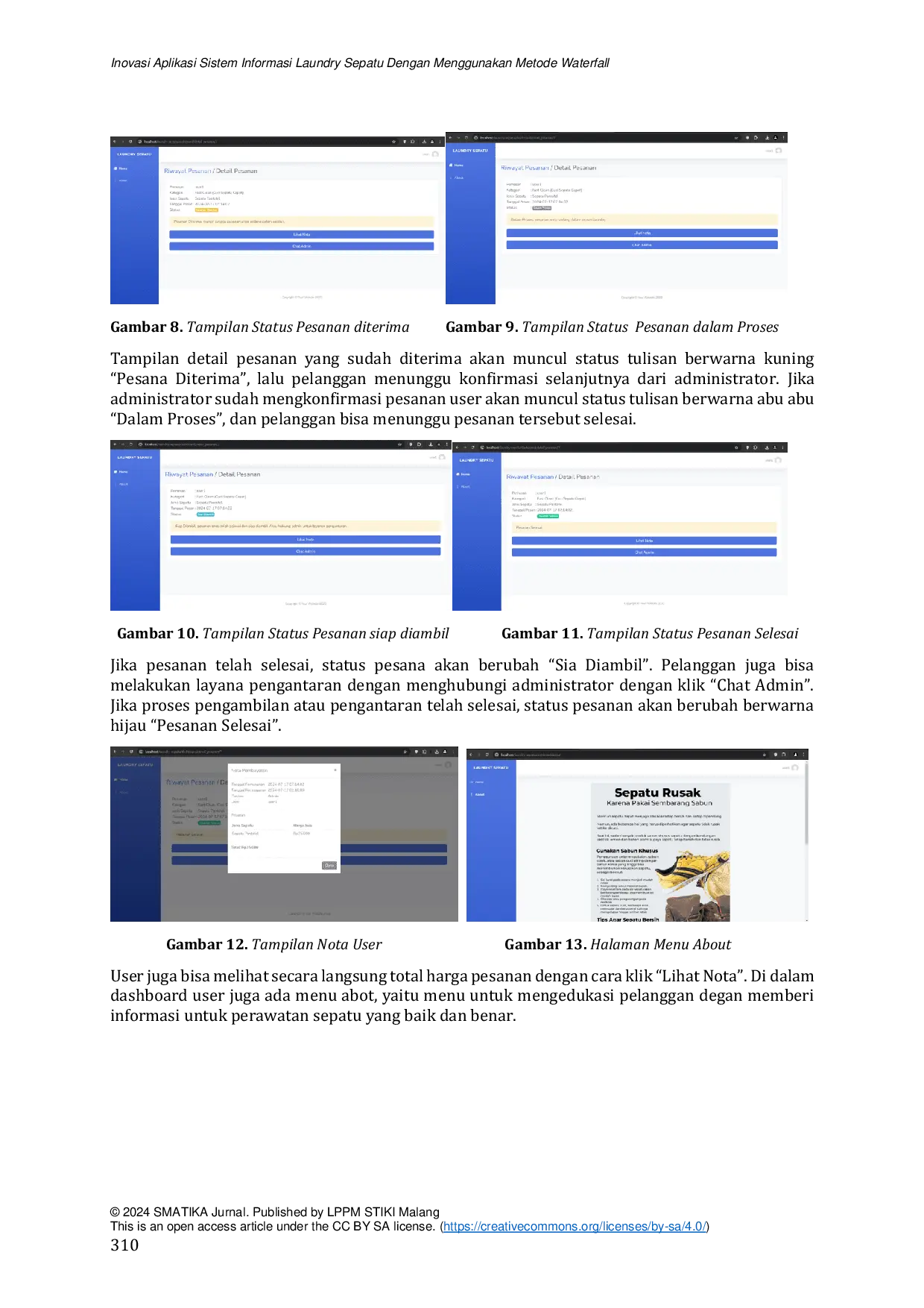 SMATIKA JURNALSMATIKA JURNALProses pengecekan laundry sepatu yang dilakukan kebanyakan pengguna masih konvensional. Pengguna masih harus mengecek dengan ke tempat laundry sepatu terlebih dahulu. Dengan cara seperti ini, masih terdapat beberapa masalah yang terjadi, terutama waktu dan tenaga yang dikeluarkan. Dalam melakukan proses pengecekan menjadi tidak efektif dan efisien sehingga dapat membuang waktu juga untuk pengambilan sepatu bagi pelanggan. Penelitian ini bertujuan untuk merancang dan membangun sistem informasi berbasis web dengan menggunakan metode Waterfall. Sistem informasi yang dibangun dapat menyelesaikan dan memberikan inovasi untuk permasalahan yang terjadi mengenai pengecekan sepatu yang belum atau sudah diproses secara cepat dan layanan pengiriman, dan memudahkan pelanggan untuk memperoleh informasi mengenai proses laundry sepatu melalui web. Sistem informasi dirancang berdasarkan tahapan yang terdapat pada metode Waterfall. Sedangkan proses pembangunan sistem informasi menggunakan aplikasi Visual Code Studio dan database MySQL.