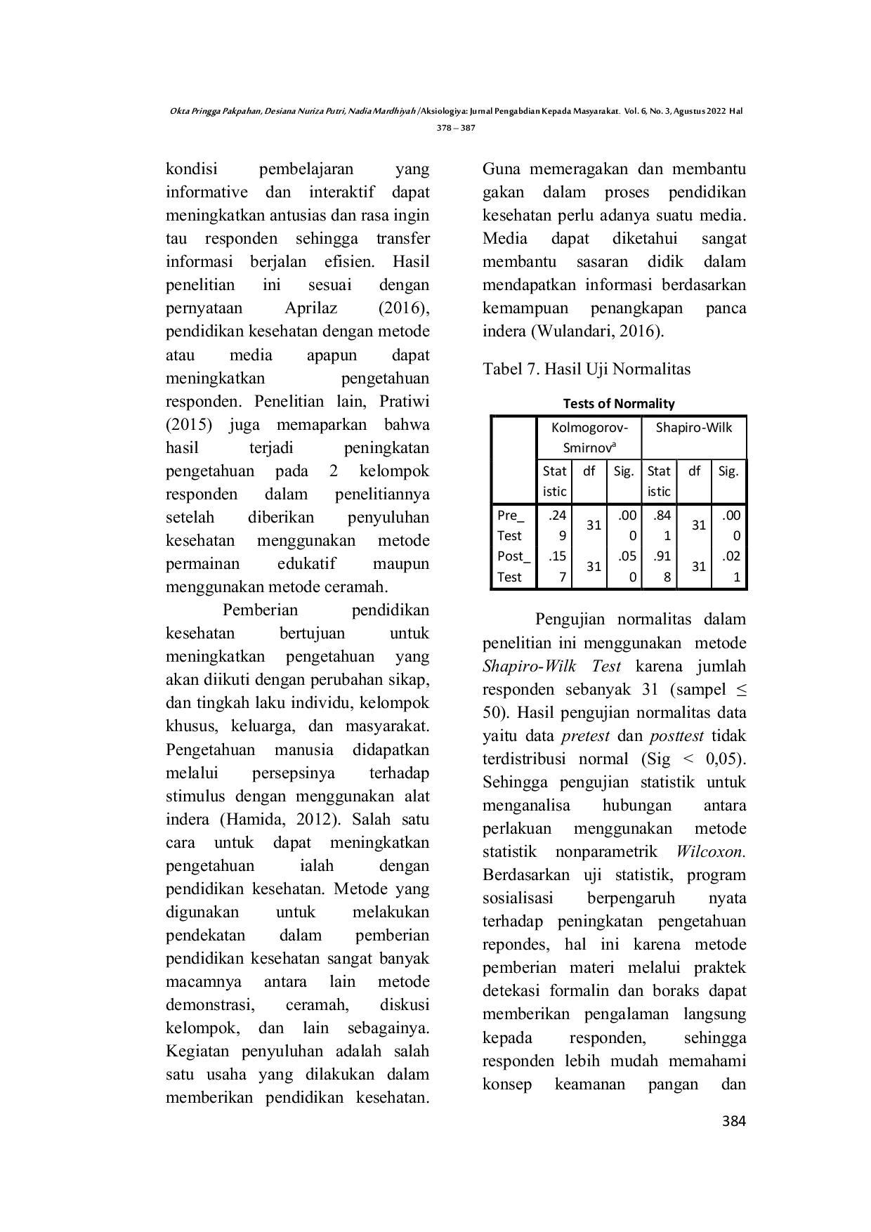 Aksiologiya: Jurnal Pengabdian Kepada MasyarakatAksiologiya: Jurnal Pengabdian Kepada MasyarakatKeamanan pangan adalah kondisi dan upaya untuk mencegah pangan dari kemungkinan cemaran kimia, biologis, dan benda lain yang merugikan, mengganggu, dan membahayakan kesehatan manusia. Tingkat keamanan pangan jajanan anak sekolah (PJAS) yang rendah masih menjadi masalah penting. Data pengawasan PJAS oleh BPOM RI menyatakan bahwa 45% PJAS tidak memenuhi ketentuan keamanan, mengandung bahan kimia seperti boraks, formalin, rhodamin, serta bahan tambahan pangan (BTP) seperti benzoat dan siklamat yang melebihi batas aman. Permasalahan di SMA Negeri 2 Batu meliputi banyaknya jajanan tidak sehat, kebiasaan siswa jajan di sekolah, tidak adanya media sekolah untuk transfer pengetahuan jajanan sehat, dan rendahnya pengetahuan pihak kantin tentang keamanan pangan. Kegiatan sosialisasi mencakup penyampaian materi keamanan pangan, praktik uji formalin dan boraks, serta evaluasi melalui kuesioner. Penelitian ini bertujuan untuk mengetahui pengaruh program sosialisasi terhadap peningkatan pengetahuan siswa melalui pengukuran pre-test dan post-test. Data dianalisis menggunakan metode nonparametrik uji Wilcoxon untuk dua sampel berhubungan. Hasil menunjukkan bahwa program sosialisasi konsep keamanan pangan secara signifikan meningkatkan pemahaman siswa, guru, dan civitas akademika terhadap keamanan pangan (p < 0.05).