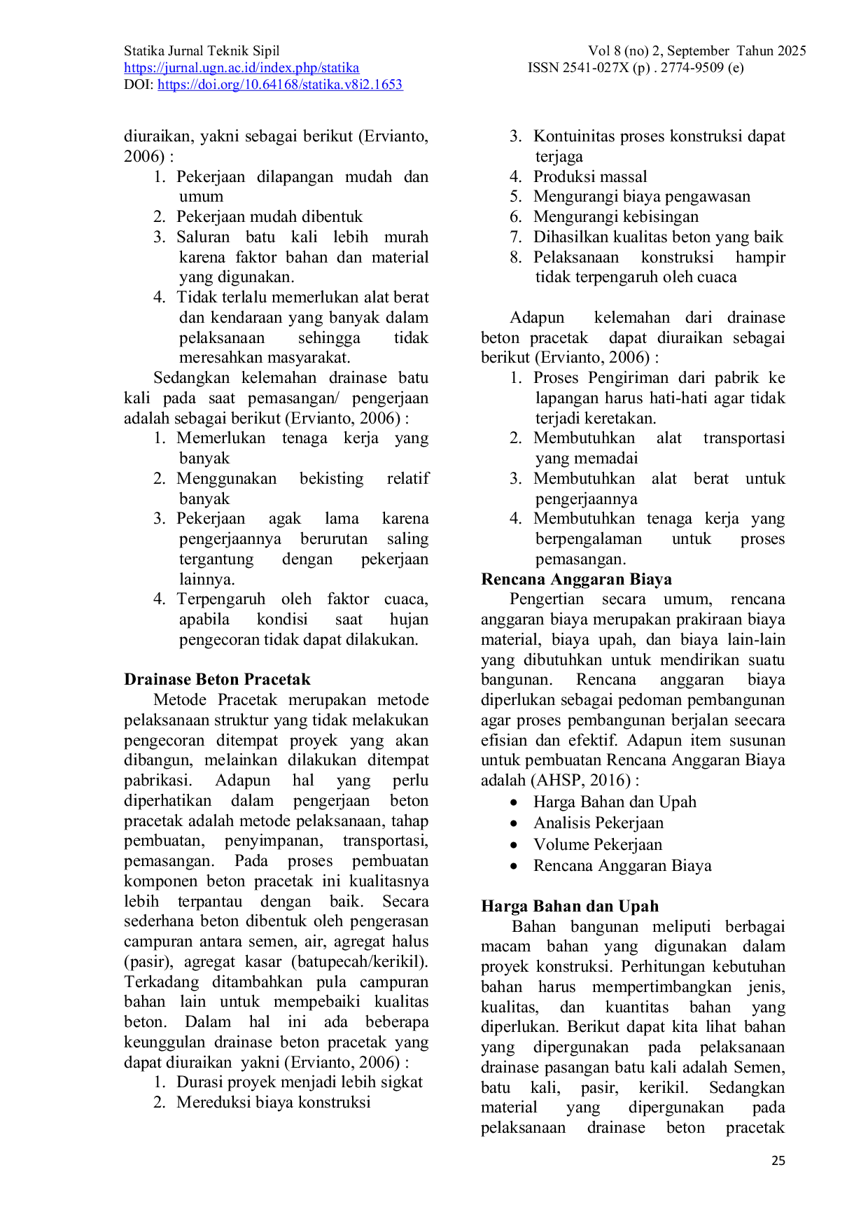 STATIKASTATIKASistem drainase merupakan rangkaian kegiatan untuk mengalirkan air permukaan maupun air tanah dari suatu daerah. Batu kali merupakan material drainase yang umum digunakan. Seiring pertumbuhan penduduk dan industri properti, kebutuhan material drainase berkualitas meningkat. Penelitian ini bertujuan untuk mengetahui perbandingan biaya dan waktu pelaksanaan antara drainase beton pracetak U-Ditch dan drainase batu kali. Metode yang digunakan adalah Analisa Harga Satuan Pekerjaan tahun 2016. Hasil analisis menunjukkan biaya drainase batu kali adalah Rp.286.625.509,05, sedangkan drainase beton pracetak adalah Rp.354.593.600,00, dengan selisih Rp.67.968.090,75. Waktu pelaksanaan drainase batu kali adalah 56 hari, sedangkan drainase beton pracetak adalah 17 hari, dengan jumlah tukang yang sama. Drainase beton pracetak lebih efisien dalam waktu pelaksanaan dibandingkan pasangan batu kali.