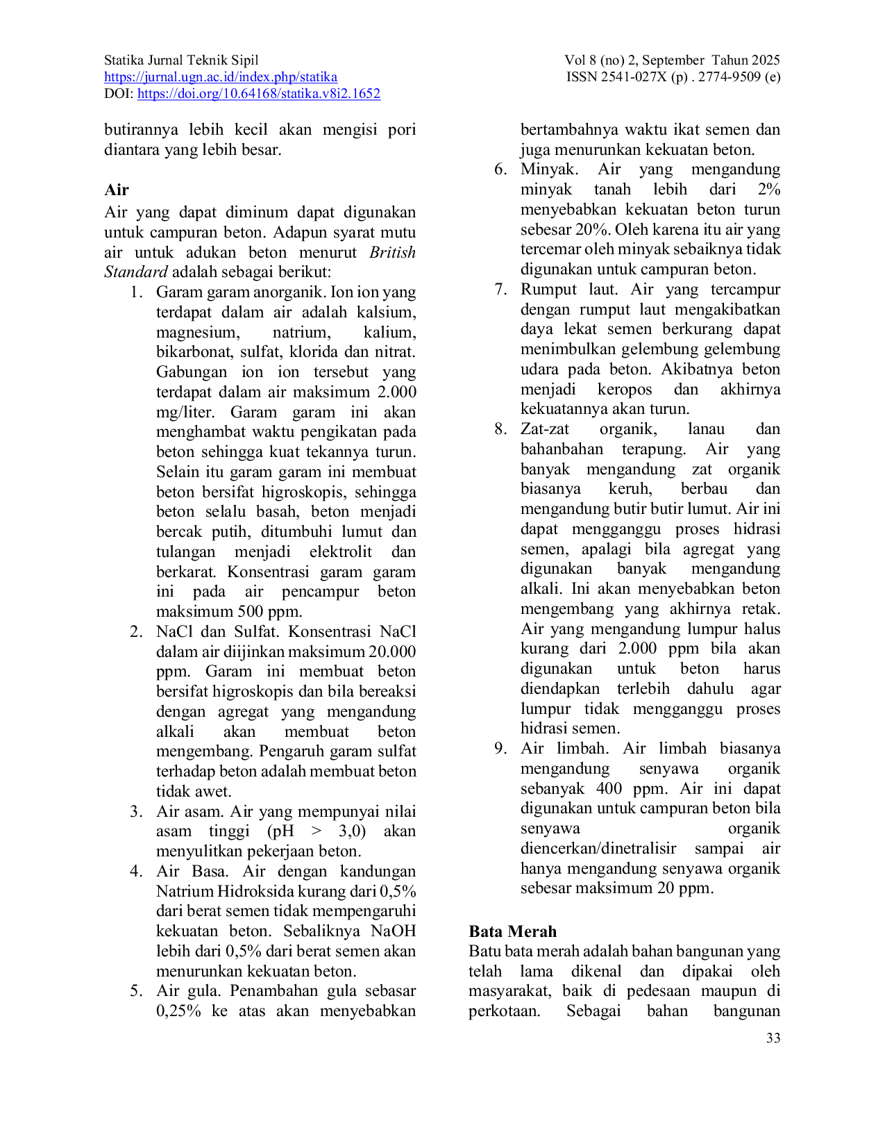 STATIKASTATIKABeton adalah campuran antara semen Portland atau semen hidraulik lainnya, agregat halus, agregat kasar, dan air, dengan atau tanpa bahan tambahan yang membentuk massa padat. Agregat sangat memiliki peran penting dalam pembuatan sebuah beton. Pada penelitian ini penulis mencoba memanfaatkan limbah bata merah sebagai pengganti agregat halus dalam campuran beton. Tujuan penelitian ini adalah mengetahui nilai kuat tekan beton pada umur 7, 14, dan 28 hari yang dihasilkan dari penggunaan limbah bata merah sebagai pengganti sebagian agregat halus. Penelitian dilakukan di laboratorium beton dan struktur teknik sipil Fakultas Teknik Universitas Graha Nusantara Padangsidimpuan. Berdasarkan hasil pengujian kuat tekan beton berdasarkan variasi campuran untuk umur 7, 14, dan 28 hari didapatkan nilai beton normal sebesar 11,18 MPa, 13,94 MPa, dan 17,13 MPa; untuk variasi 5 % limbah bata merah masing‑masing 9,98 MPa, 9,70 MPa, dan 16,99 MPa; serta untuk variasi 10 % masing‑masing 9,48 MPa, 11,89 MPa, dan 14,58 MPa. Penurunan mutu beton mengindikasikan perlunya pertimbangan risiko penurunan nilai kuat tekan ketika menggunakan limbah bata merah sebagai pengganti sebagian agregat halus.