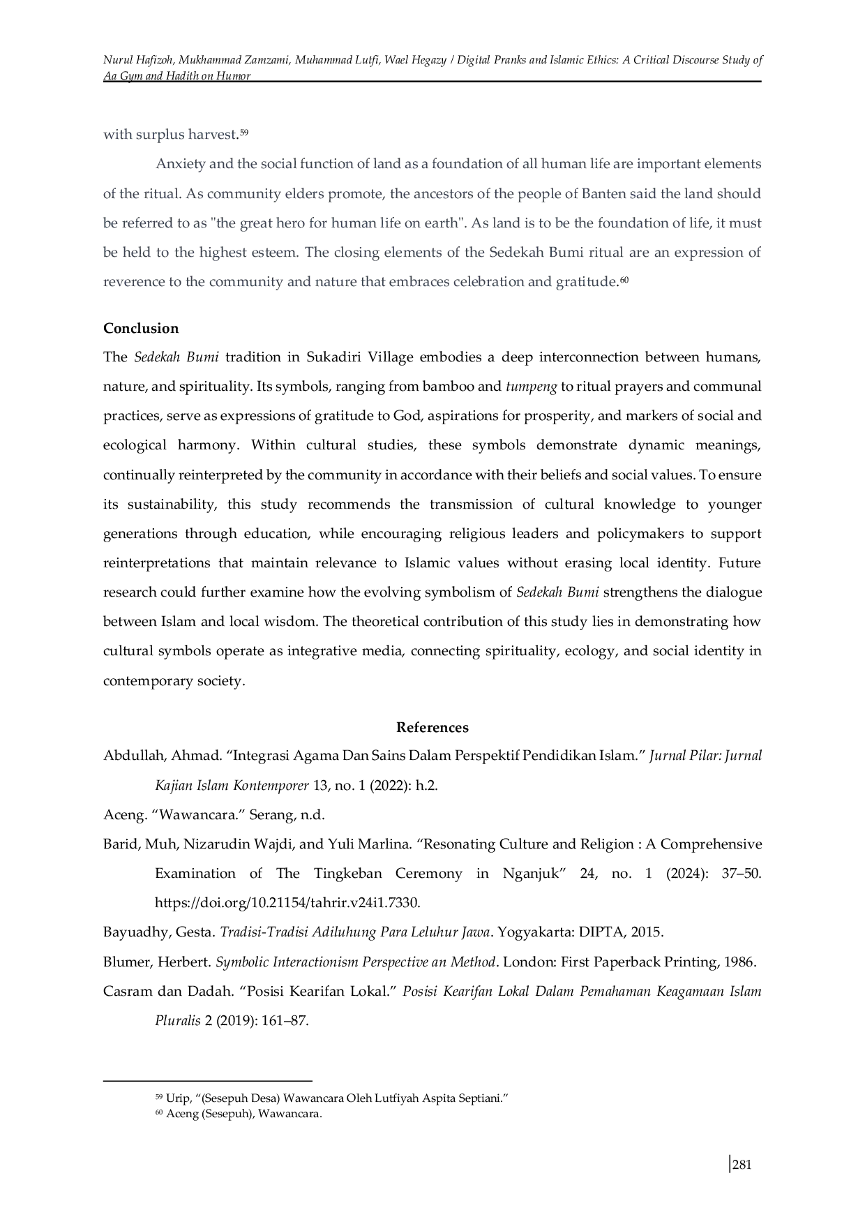 Penelitian ini mengungkap makna mendalam dari tradisi Sedekah Bumi di Desa Sukadiri, Banten, yang menunjukkan hubungan erat antara manusia, alam, dan spiritualitas.Simbol-simbol yang digunakan dalam tradisi ini, seperti bambu awi, tumpeng, ritual persembahan, dan doa bersama, tidak hanya merepresentasikan rasa syukur kepada Tuhan, tetapi juga menegaskan pentingnya menjaga keseimbangan ekologis dan mempererat hubungan sosial.Tradisi Sedekah Bumi menjadi fondasi yang kokoh dalam memperkuat identitas masyarakat dan menjaga keberlangsungan budaya lokal di tengah perubahan zaman.Untuk keberlanjutan tradisi ini, perlu dilakukan upaya transmisi pengetahuan budaya kepada generasi muda melalui pendidikan dan dukungan dari pemerintah serta tokoh agama agar tetap relevan dengan nilai-nilai Islam.