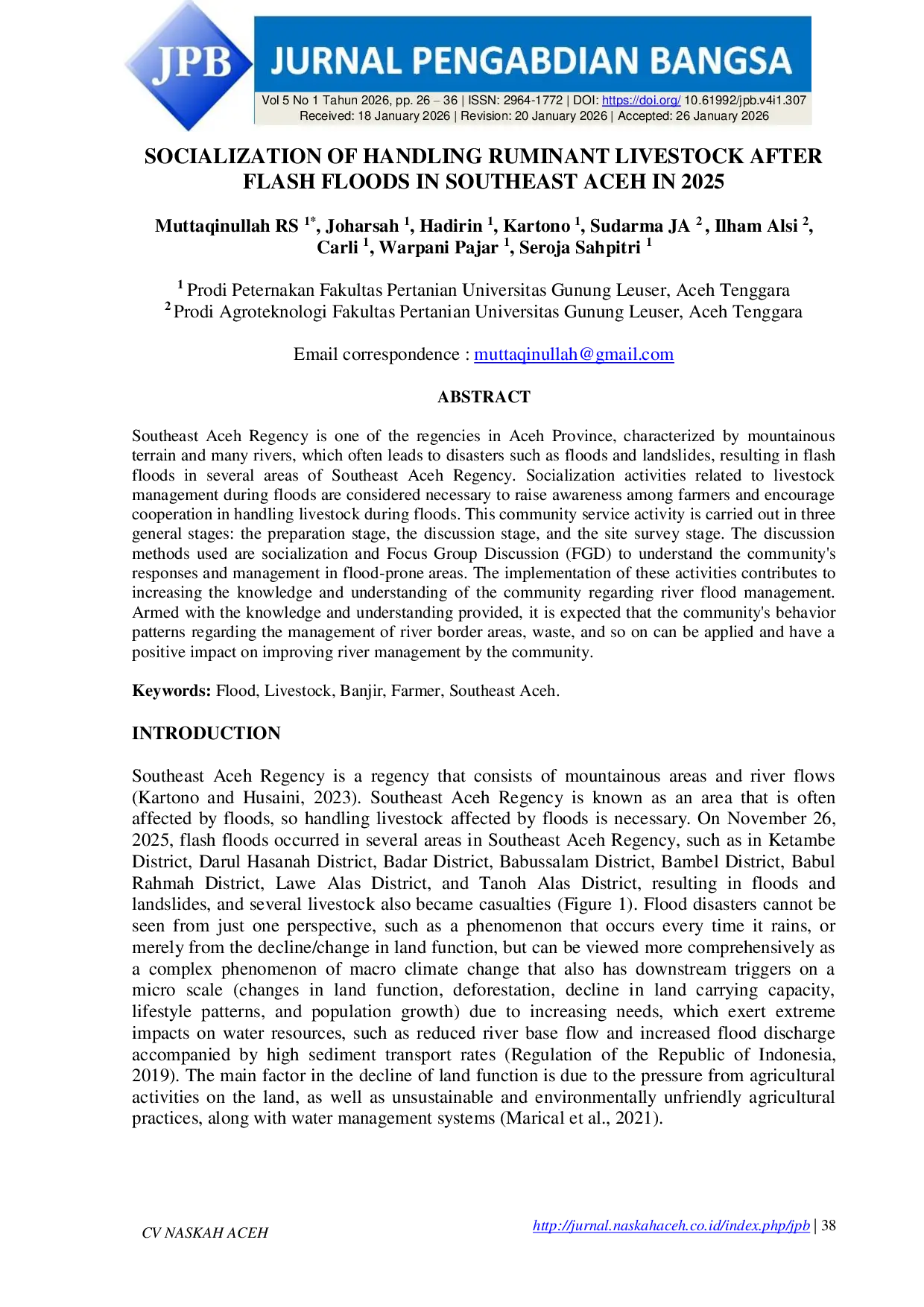 Jurnal Pengabdian BangsaJurnal Pengabdian BangsaKabupaten Aceh Tenggara adalah salah satu kabupaten di Provinsi Aceh yang dicirikan oleh daerah pegunungan dan banyak sungai, yang sering menyebabkan bencana seperti banjir dan tanah longsor, sehingga menyebabkan banjir bandang di beberapa daerah di Kabupaten Aceh Tenggara. Kegiatan sosialisasi terkait pengelolaan ternak saat banjir dianggap perlu untuk meningkatkan kesadaran masyarakat dan menggalakkan kerjasama dalam menangani ternak selama banjir.