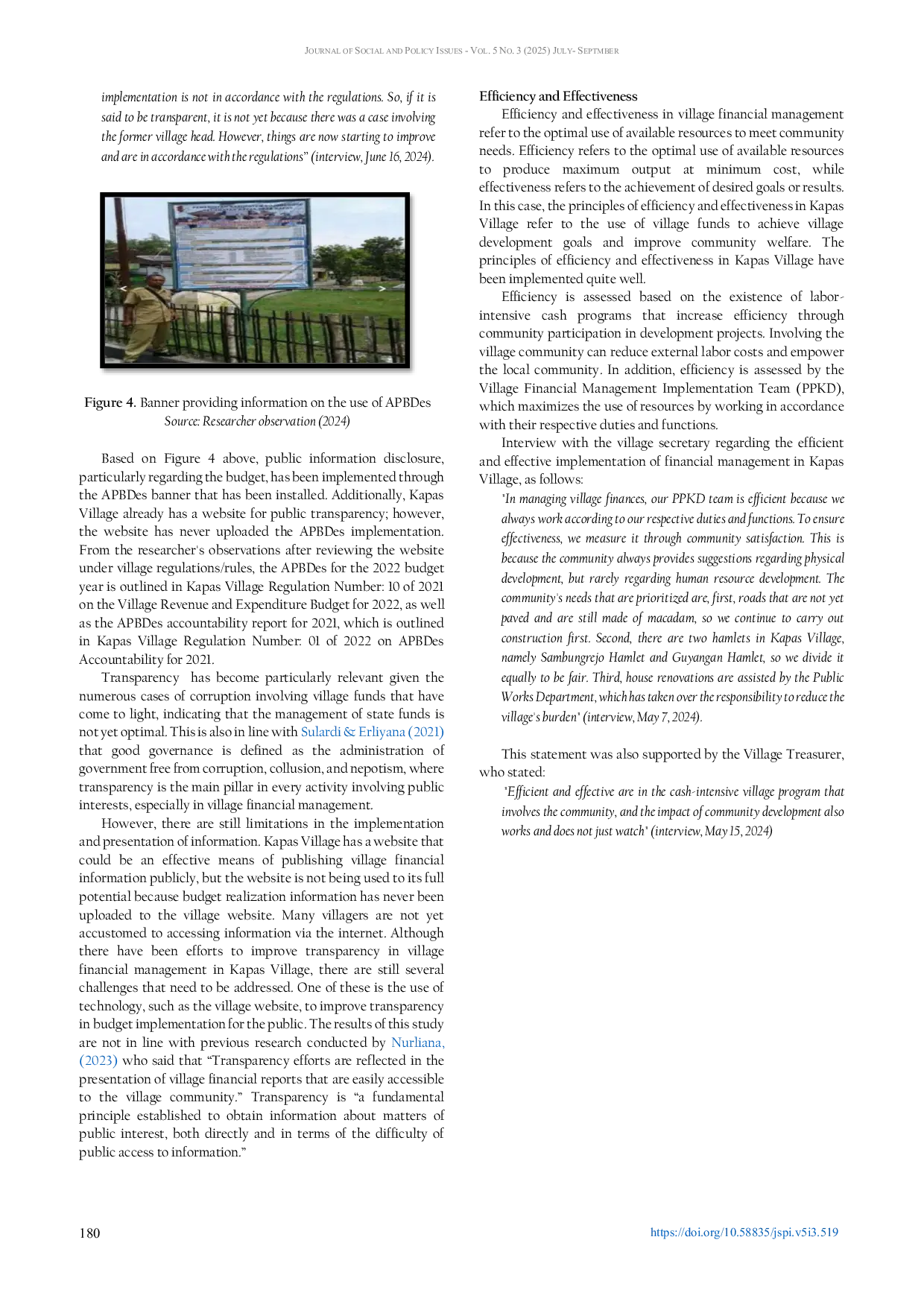 Journal of Social and Policy IssuesJournal of Social and Policy IssuesTujuan dari penelitian ini adalah menganalisis model pengelolaan keuangan desa berdasarkan prinsip tata kelola yang baik. Metode penelitian menggunakan pendekatan kualitatif dengan desain studi kasus, pengumpulan data melalui teknik observasi, wawancara mendalam, dan analisis dokumen. Validasi data dilakukan melalui triangulasi sumber dan metode pengumpulan data. Subjek penelitian terdiri dari 17 orang informan. Hasil penelitian menunjukkan bahwa akuntabilitas telah ada namun tidak disertai komitmen. Partisipasi masyarakat lebih fokus pada hasil pengembangan daripada pemantauan penggunaan anggaran. Penggunaan website desa untuk transparansi keuangan masih minimal. Enakses hukum masih menunjukkan ketidakpatuhan terhadap regulasi pengelolaan keuangan desa, sehingga diperlukan konsep pengawasan preventif. Penelitian ini menunjukkan bahwa pemerintahan desa Kapas belum sepenuhnya menerapkan prinsip tata kelola yang baik dalam pengelolaan keuangan. Keterbatasan penelitian berhubungan dengan kurangnya cakupan aspek kesetaraan, visi, strategi, responsif, dan prinsip konsensus dalam pengelolaan keuangan desa. Implikasi penelitian ini adalah pengembangan konsep pengelolaan keuangan dalam tata kelola desa di Indonesia.