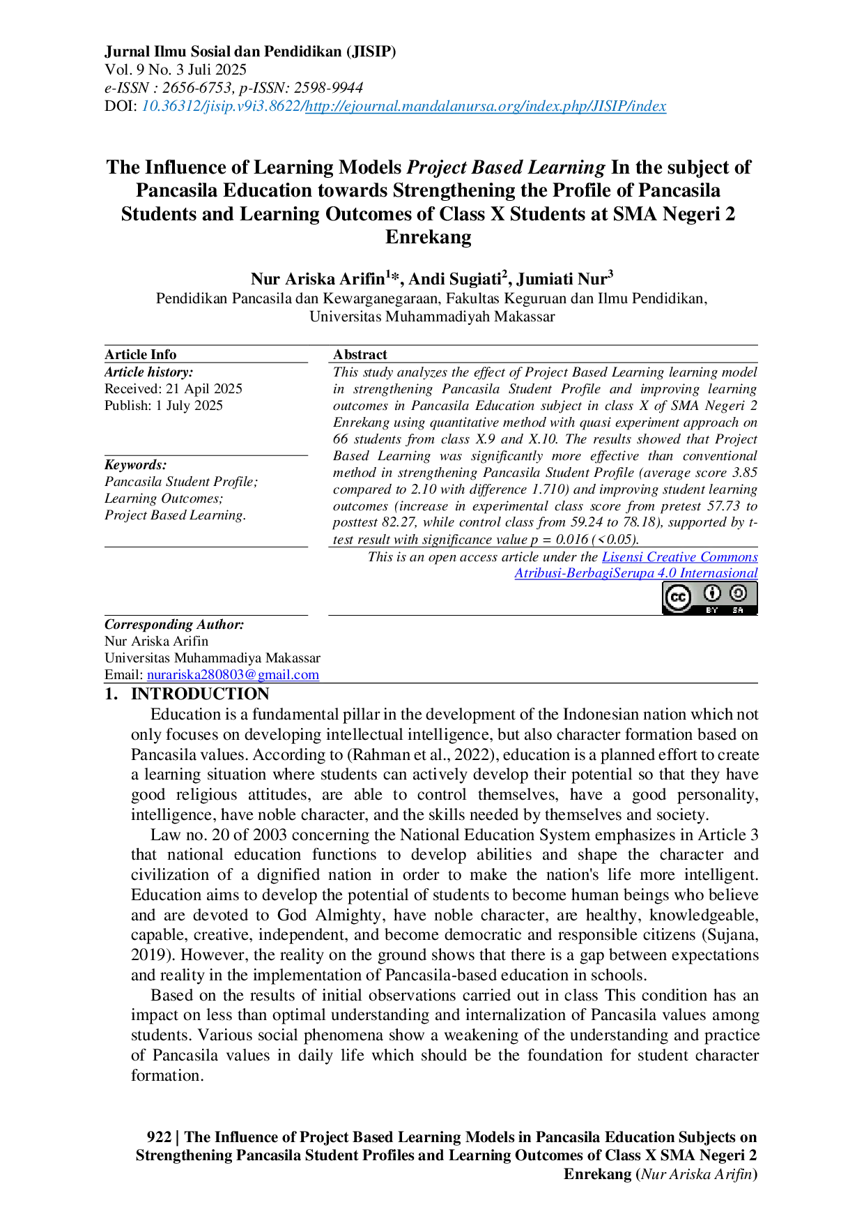 JISIP (Jurnal Ilmu Sosial dan Pendidikan)JISIP (Jurnal Ilmu Sosial dan Pendidikan)Penelitian ini menganalisis pengaruh model pembelajaran Project Based Learning dalam memperkuat Profil Pelajar Pancasila dan meningkatkan hasil belajar pada mata pelajaran Pendidikan Pancasila di kelas X SMA Negeri 2 Enrekang menggunakan metode kuantitatif dengan pendekatan eksperimen semu terhadap 66 siswa dari kelas X.9 dan X.10. Hasil menunjukkan bahwa Project Based Learning secara signifikan lebih efektif daripada metode konvensional dalam memperkuat Profil Pelajar Pancasila (rata-rata skor 3,85 dibandingkan dengan 2,10 dengan selisih 1,710) dan meningkatkan hasil belajar siswa (peningkatan skor kelas eksperimen dari pretest 57,73 menjadi posttest 82,27, sedangkan kelas kontrol dari 59,24 menjadi 78,18), didukung oleh hasil uji-t dengan nilai signifikansi p = 0,016 (<0,05).