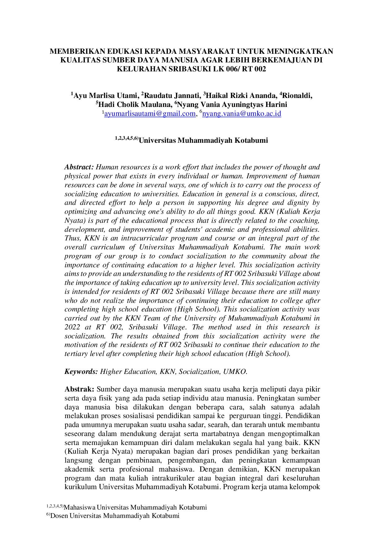 Pengabdian Kepada Masyarakat CendekiaPengabdian Kepada Masyarakat CendekiaSumber daya manusia merupakan suatu usaha kerja meliputi daya pikir serta daya fisik yang ada pada setiap individu atau manusia. Peningkatan sumber daya manusia bisa dilakukan dengan beberapa cara, salah satunya adalah melakukan proses sosialisasi pendidikan sampai ke perguruan tinggi. Pendidikan pada umumnya merupakan suatu usaha sadar, searah, dan terarah untuk membantu seseorang dalam mendukung derajat serta martabatnya dengan mengoptimalkan serta memajukan kemampuan diri dalam melakukan segala hal yang baik. KKN (Kuliah Kerja Nyata) merupakan bagian dari proses pendidikan yang berkaitan langsung dengan pembinaan, pengembangan, dan peningkatan kemampuan akademik serta profesional mahasiswa. Dengan demikian, KKN merupakan program dan mata kuliah intrakurikuler atau bagian integral dari keseluruhan kurikulum Universitas Muhammadiyah Kotabumi. Program kerja utama kelompok kami adalah dengan mengadakan sosialisasi kepada masyarakat tentang pentingnya melanjutkan pendidikan ke jenjang yang lebih tinggi. Kegiatan sosialisasi ini bertujuan untuk memberikan pemahaman dan mengajak masyarakat RT 002 Kelurahan Sribasuki untuk menempuh pendidikan sampai jenjang perguruan tinggi. Kegiatan sosialisasi ini ditujukan untuk warga RT 002 Kelurahan Sribasuki karena masih banyak yang belum menyadari pentingnya melanjutkan pendidikan ke perguruan tinggi setelah menyelesaikan pendidikan SMA (Sekolah Menengah Atas). Kegiatan sosialisasi ini dilaksanakan oleh Tim KKN Universitas Muhammadiyah Kotabumi tahun 2022 di RT 002 Kelurahan Sribasuki. Metode yang digunakan dalam KKN ini ialah sosialisasi. Hasil yang diperoleh dari kegiatan sosialisasi ini ialah termotivasinya warga RT 002 Sribasuki untuk melanjutkan pendidikan ke jenjang perguruan tinggi setelah menyelesaikan pendidikan SMA (Sekolah Menengah Atas).
