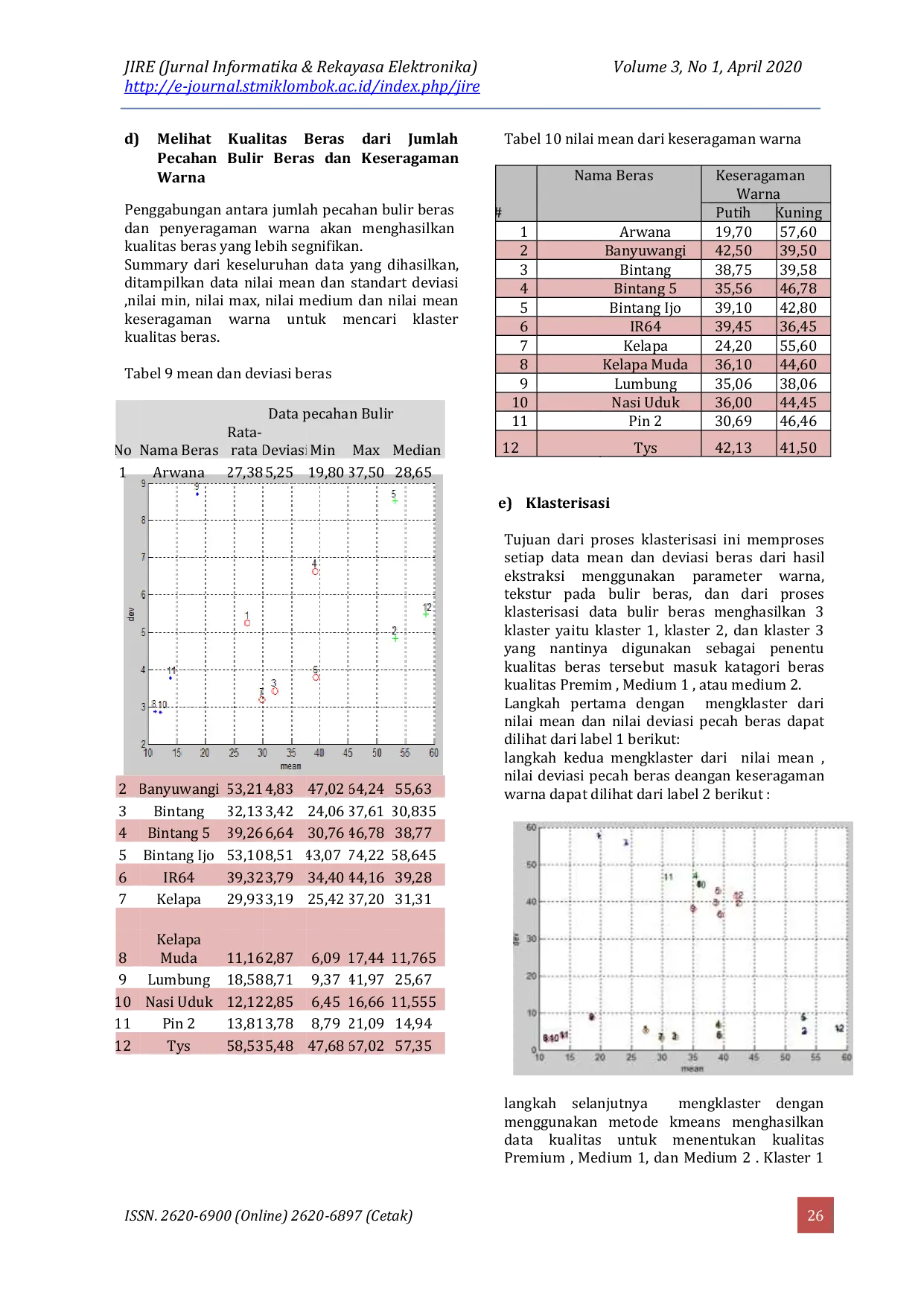 Binerisasi dengan metode Otsu berhasil memisahkan beras utuh dan pecah secara akurat.Proses penyeragaman warna melalui kuantisasi minimal varian membantu evaluasi kualitas beras.Penerapan K-means dan K-Nearest Neighbour memberikan keakuratan klasifikasi mencapai 99,70%.