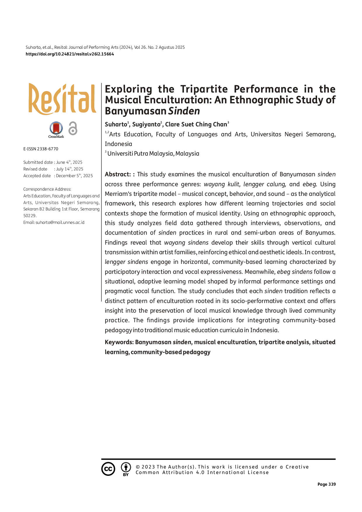 The study demonstrates that the musical enculturation of Banyumasan sinden occurs through interconnected processes across various performance contexts.Learning progresses through active participation, embodied practice, and continuous social engagement, rather than solely through formal instruction.This research highlights the importance of family, community, and stage experience in shaping musical behavior, concepts, and sound output, contributing to the preservation of Banyumasan vocal traditions.