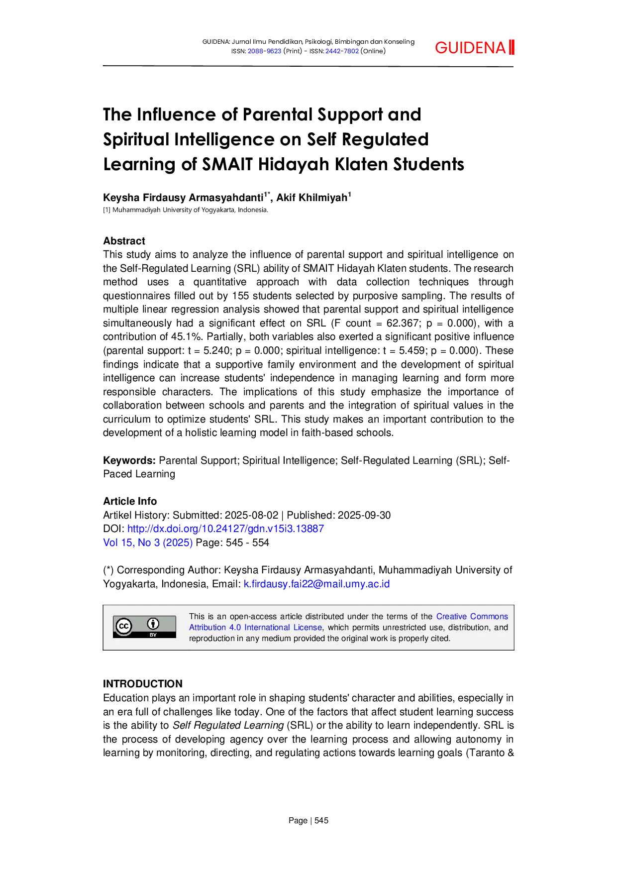 GUIDENA: Jurnal Ilmu Pendidikan, Psikologi, Bimbingan dan KonselingGUIDENA: Jurnal Ilmu Pendidikan, Psikologi, Bimbingan dan KonselingPenelitian ini bertujuan untuk menganalisis pengaruh dukungan orang tua dan kecerdasan spiritual terhadap kemampuan Self-Regulated Learning (SRL) siswa SMAIT Hidayah Klaten. Metode penelitian menggunakan pendekatan kuantitatif dengan pengumpulan data melalui kuesioner yang diisi oleh 155 siswa yang dipilih dengan purposive sampling. Hasil analisis regresi linier berganda menunjukkan bahwa dukungan orang tua dan kecerdasan spiritual secara simultan berpengaruh signifikan terhadap SRL (F hitung = 62.367; p = 0,000), dengan kontribusi sebesar 45,1%. Secara parsial, kedua variabel juga memberikan pengaruh positif yang signifikan (dukungan orang tua: t = 5,240; p = 0,000; kecerdasan spiritual: t = 5,459; p = 0,000). Temuan ini menunjukkan bahwa lingkungan keluarga yang suportif dan pengembangan kecerdasan spiritual dapat meningkatkan kemandirian siswa dalam mengelola pembelajaran serta membentuk karakter yang lebih bertanggung jawab. Implikasi dari penelitian ini menekankan pentingnya kolaborasi antara sekolah dan orang tua serta integrasi nilai-nilai spiritual dalam kurikulum untuk mengoptimalkan SRL siswa. Penelitian ini memberikan kontribusi penting terhadap pengembangan model pembelajaran holistik di sekolah berbasis iman.