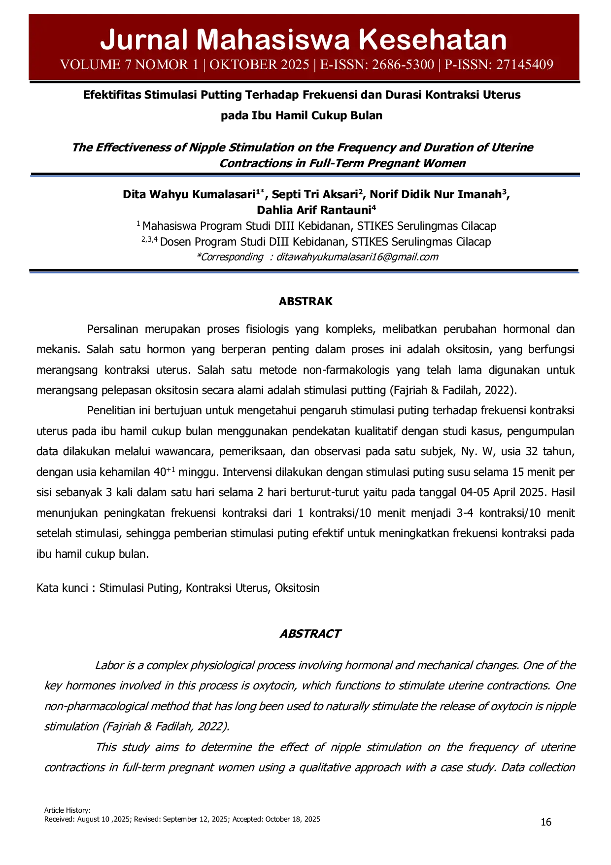 Jurnal Mahasiswa KesehatanJurnal Mahasiswa KesehatanPersalinan merupakan proses fisiologis yang kompleks, melibatkan perubahan hormonal dan mekanis. Salah satu hormon yang berperan penting dalam proses ini adalah oksitosin, yang berfungsi merangsang kontraksi uterus. Salah satu metode non-farmakologis yang telah lama digunakan untuk merangsang pelepasan oksitosin secara alami adalah stimulasi putting (Fajriah & Fadilah, 2022). Penelitian ini bertujuan untuk mengetahui pengaruh stimulasi puting terhadap frekuensi kontraksi uterus pada ibu hamil cukup bulan menggunakan pendekatan kualitatif dengan studi kasus, pengumpulan data dilakukan melalui wawancara, pemeriksaan, dan observasi pada satu subjek, Ny. W, usia 32 tahun, dengan usia kehamilan 40 1 minggu. Intervensi dilakukan dengan stimulasi puting susu selama 15 menit per sisi sebanyak 3 kali dalam satu hari selama 2 hari berturut-turut yaitu pada tanggal 04-05 April 2025. Hasil menunjukan peningkatan frekuensi kontraksi dari 1 kontraksi/10 menit menjadi 3-4 kontraksi/10 menit setelah stimulasi, sehingga pemberian stimulasi puting efektif untuk meningkatkan frekuensi kontraksi pada ibu hamil cukup bulan.