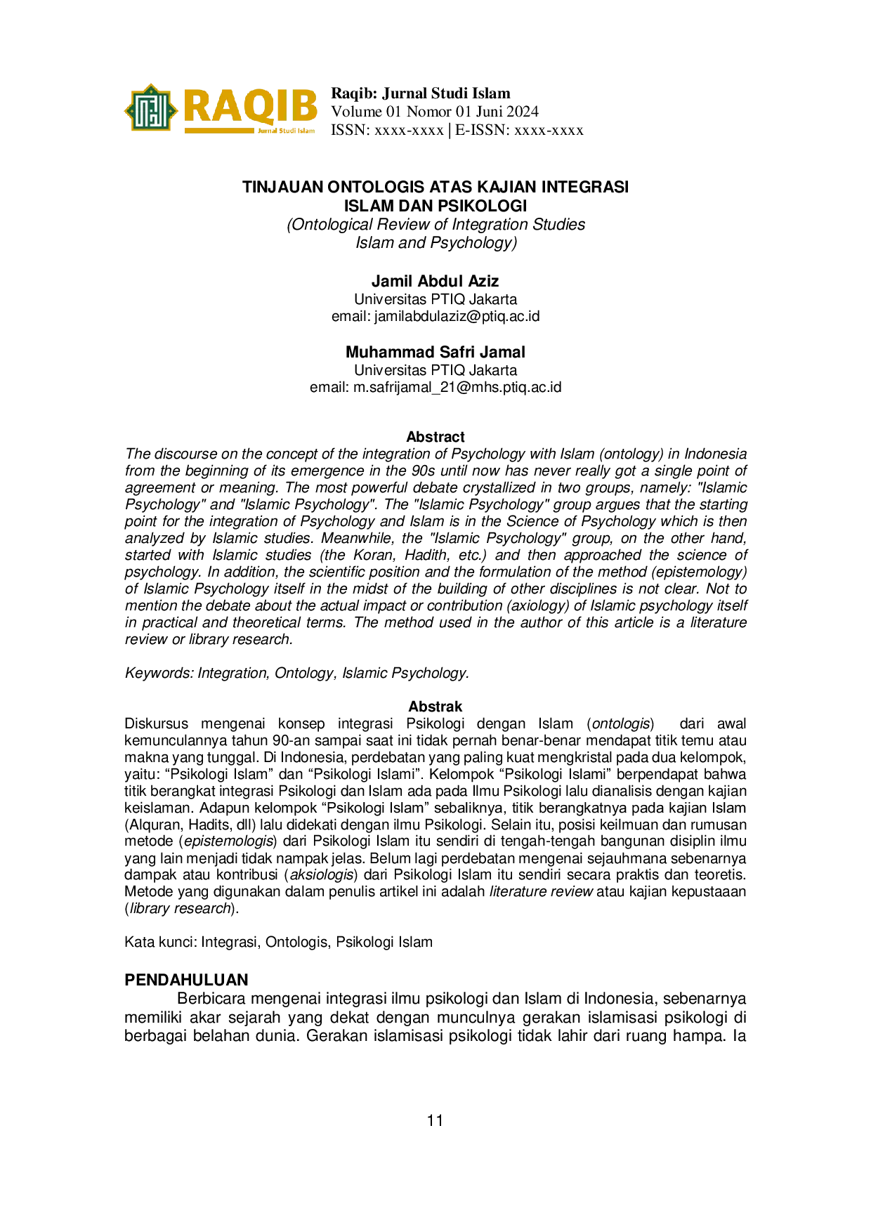 Raqib: Jurnal Studi IslamRaqib: Jurnal Studi IslamDiskursus mengenai konsep dari awal integrasi Psikologi dengan Islam di Indonesia tidak pernah benar-benar mendapat titik temu atau makna yang tunggal. Perdebatan yang paling kuat mengkristal pada dua kelompok, yaitu: “Psikologi Islami dan “Psikologi Islam. Kelompok “Psikologi Islami berpendapat bahwa titik berangkat integrasi Psikologi dan Islam ada pada Ilmu Psikologi lalu dianalisis dengan kajian keislaman. Adapun kelompok “Psikologi Islam sebaliknya, titik berangkatnya pada kajian Islam (Alquran, Hadits, dll) lalu didekati dengan ilmu Psikologi. Selain itu, posisi keilmuan dan rumusan metode (epistemologis) dari Psikologi Islam itu sendiri di tengah-tengah bangunan disiplin ilmu yang lain menjadi tidak nampak jelas. Belum lagi perdebatan mengenai sejauhmana sebenarnya dampak atau kontribusi (aksiologis) dari Psikologi Islam itu sendiri secara praktis dan teoretis. Metode yang digunakan dalam penulis artikel ini adalah literature review atau kajian kepustaaan (library research).