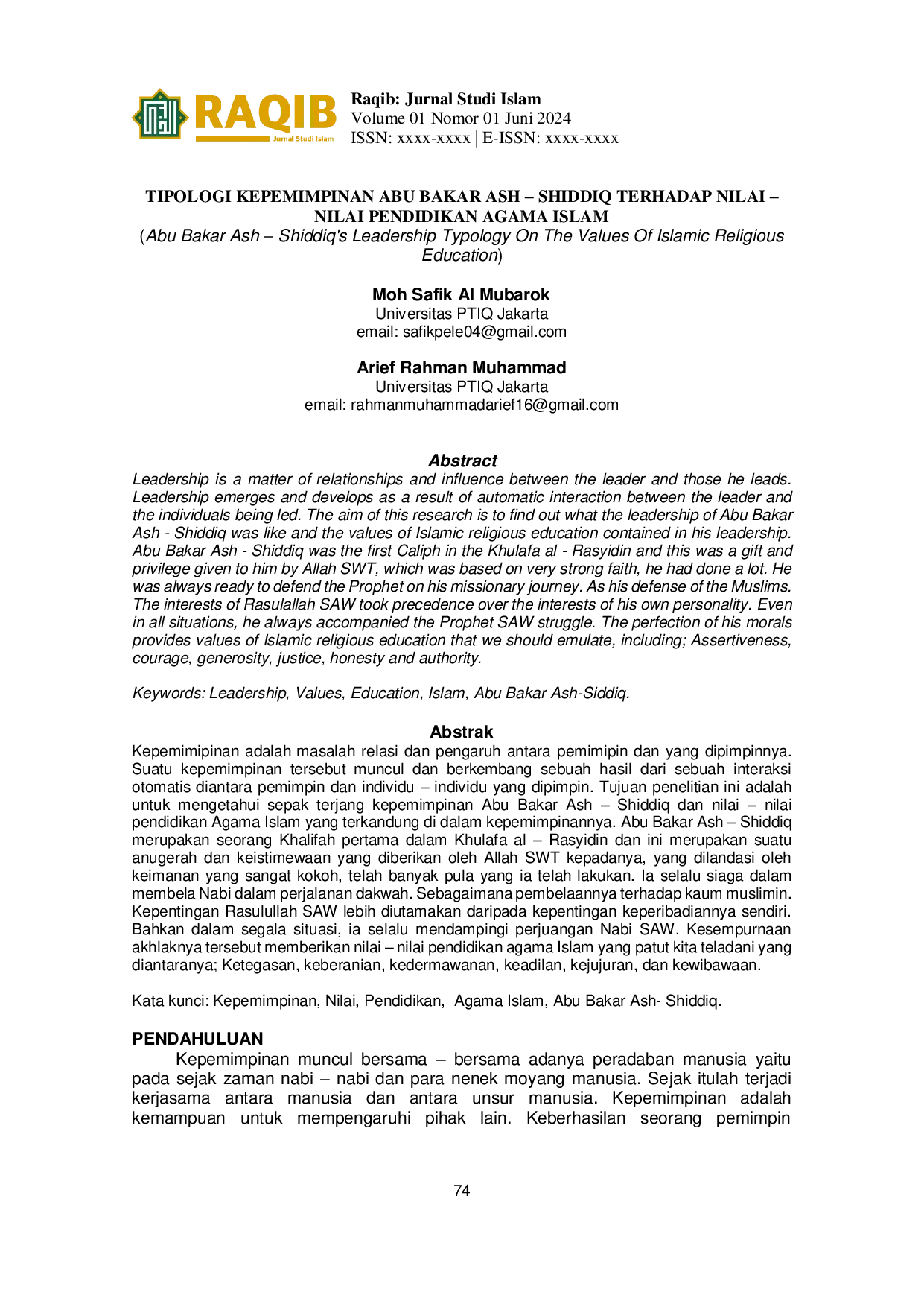 Raqib: Jurnal Studi IslamRaqib: Jurnal Studi IslamKepemimpinan adalah masalah relasi dan pengaruh antara pemimpin dan yang dipimpinnya. Suatu kepemimpinan tersebut muncul dan berkembang sebuah hasil dari sebuah interaksi otomatis diantara pemimpin dan individu – individu yang dipimpin. Tujuan penelitian ini adalah untuk mengetahui sepak terjang kepemimpinan Abu Bakar Ash – Shiddiq dan nilai – nilai pendidikan Agama Islam yang terkandung di dalam kepemimpinannya. Abu Bakar Ash – Shiddiq merupakan seorang Khalifah pertama dalam Khulafa al – Rasyidin dan ini merupakan suatu anugerah dan keistimewaan yang diberikan oleh Allah SWT kepadanya, yang dilandasi oleh keimanan yang sangat kokoh, telah banyak pula yang ia telah lakukan. Ia selalu siaga dalam membela Nabi dalam perjalanan dakwah. Sebagaimana pembelaannya terhadap kaum muslimin. Kepentingan Rasulullah SAW lebih diutamakan daripada kepentingan keperibadiannya sendiri. Bahkan dalam segala situasi, ia selalu mendampingi perjuangan Nabi SAW. Kesempurnaan akhlaknya tersebut memberikan nilai – nilai pendidikan agama Islam yang patut kita teladani yang diantaranya; Ketegasan, keberanian, kedermawanan, keadilan, kejujuran, dan kewibawaan.