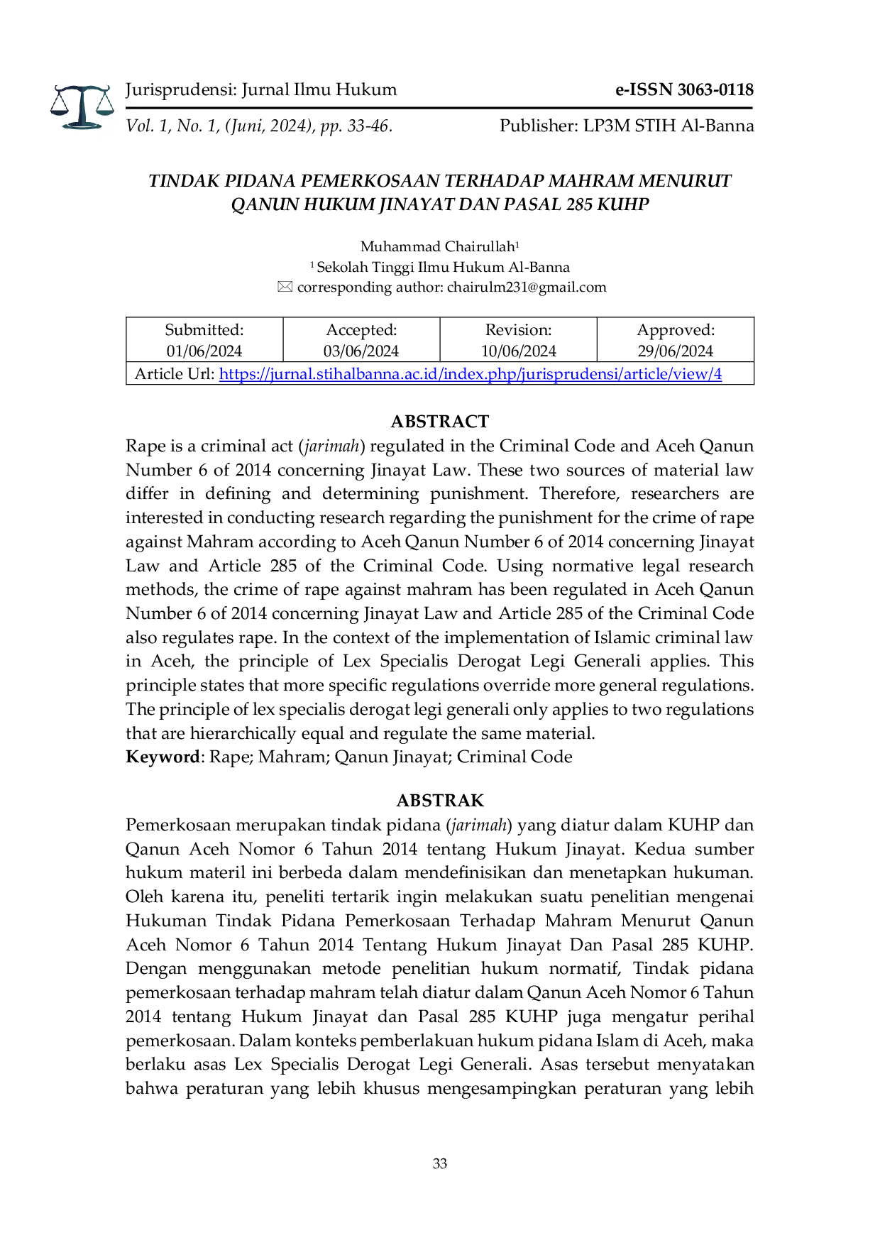 Jurisprudensi: Jurnal Ilmu HukumJurisprudensi: Jurnal Ilmu HukumPemerkosaan merupakan tindak pidana (jarimah) yang diatur dalam KUHP dan Qanun Aceh Nomor 6 Tahun 2014 tentang Hukum Jinayat. Kedua sumber hukum materil ini berbeda dalam mendefinisikan dan menetapkan hukuman. Oleh karena itu, peneliti tertarik ingin melakukan suatu penelitian mengenai hukuman tindak pidana pemerkosaan terhadap mahram menurut Qanun Aceh Nomor 6 Tahun 2014 tentang Hukum Jinayat dan Pasal 285 KUHP. Dengan menggunakan metode penelitian hukum normatif, tindak pidana pemerkosaan terhadap mahram telah diatur dalam Qanun Aceh Nomor 6 Tahun 2014 tentang Hukum Jinayat dan Pasal 285 KUHP juga mengatur perihal pemerkosaan. Dalam konteks pemberlakuan hukum pidana Islam di Aceh, maka berlaku asas Lex Specialis Derogat Legi Generali. Asas tersebut menyatakan bahwa peraturan yang lebih khusus mengesampingkan peraturan yang lebih umum. Asas lex specialis derogat legi generali hanya berlaku terhadap dua peraturan yang secara hierarki sederajat dan mengatur mengenai materi yang sama.