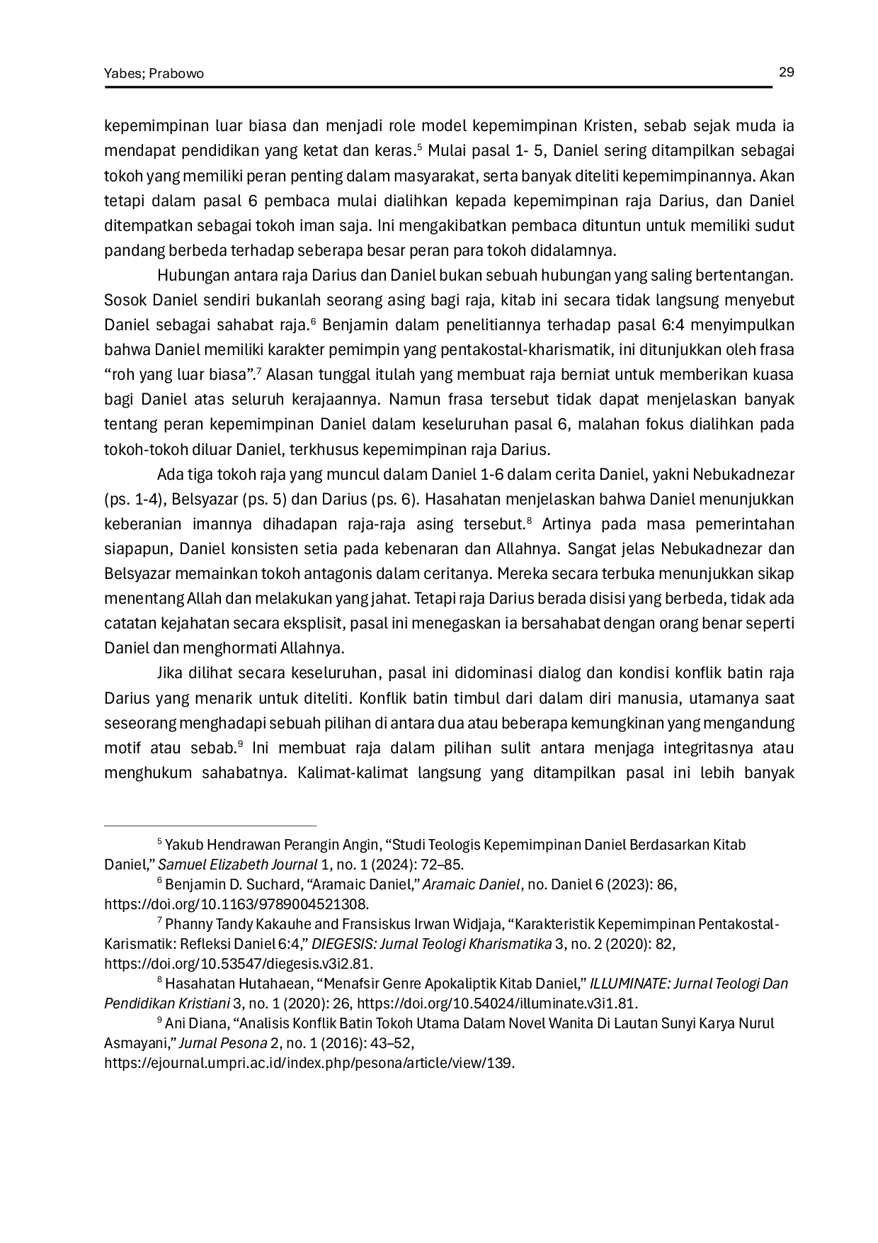 Nahiru: Jurnal Teologi dan Keagamaan KristenNahiru: Jurnal Teologi dan Keagamaan KristenDaniel 6 mengisahkan peristiwa dilematis kepemimpinan raja Darius yang terpaksa menghukum Daniel akibat tipu daya para pejabatnya. Pasal ini didominasi dialog dan kondisi konflik batin raja Darius yang menarik untuk diteliti. Ada tiga tokoh raja yang muncul dalam Daniel 1-6, yakni Nebukadnezar (ps. 1-4), Belsyazar (ps. 5) dan Darius (ps. 6), namun Darius berada disisi yang berbeda. Ia sosok protagonis yang menghormati Daniel dan Allahnya. Darius telah menerima banyak perhatian dalam diskusi aspek historis berkaitan tentang identitasnya, namun sedikit yang memberi perhatian pada perannya. Penulis berusaha menganalisa bagaimana raja Darius dalam kekuasaannya menyikapi kondisi dilema terhadap Daniel dengan memperhatikan teks yang penting pada pasal 6. Penulisan artikel ini menggunakan metode penelitian kualitatif dengan pendekatan eksegeses. Melalui penelitian ini penulis menemukan bahwa raja Darius Darius adalah pemimpin yang menerapkan sifat-sifat ilahi dari Allah, utamanya kesetiaan pada kebenaran dan keadilan. Ia sosok yang percaya kepada orang benar, bersedih terhadap kejahatan, menaruh hormat terhadap hukum dan undang-undang, percaya kepada pengharapan, menyatakan keadilan dan kebesaran Allah.